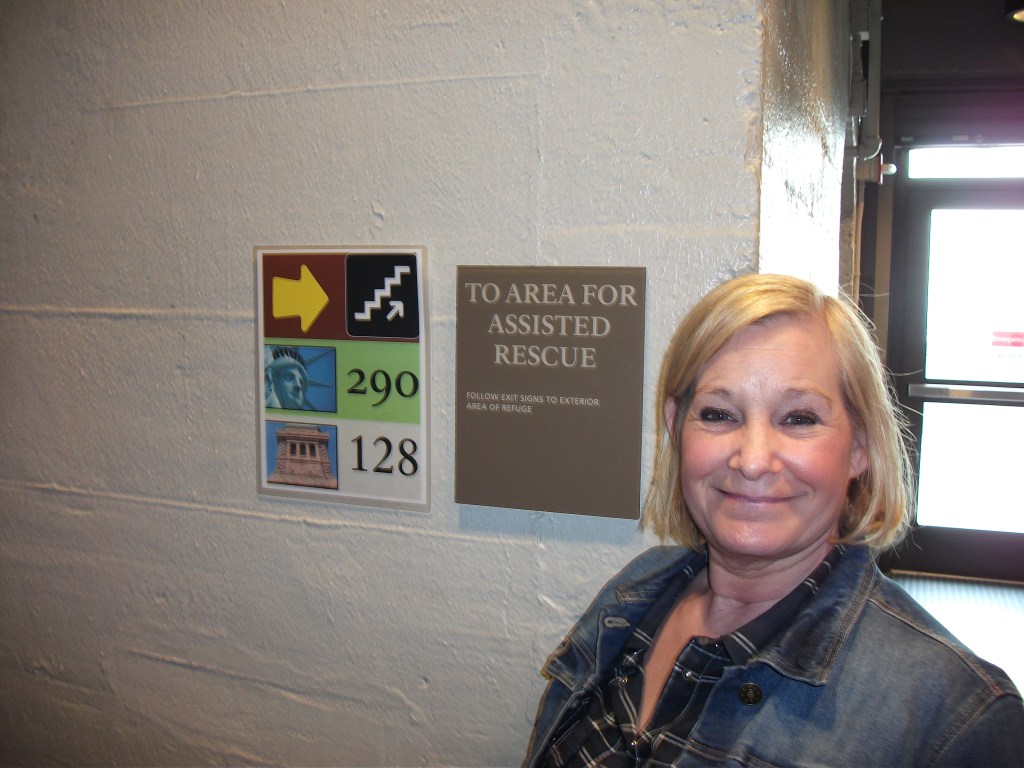 We take the elevator to the 100th floor and we’re instantly wowed! I won’t say how, I wouldn’t want to spoil the surprise but it’s pretty impressive! We take a walk of the floor and spot Lady Liberty looking like a tiny doll in the distance. Mum poses for a picture and some woman decides she wants in too. Mum’s face is classic!