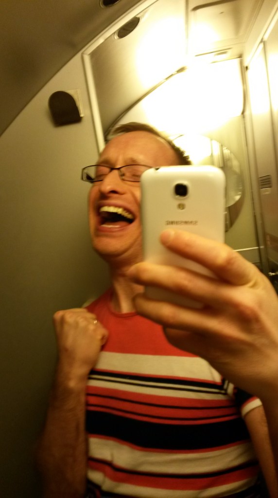 I look at the boarding pass, thank the nice man and his manager and we head up the escalator to the departure gates. As soon as we’re out of sight of the check-in desks, we both jump around with our hands flailing in the air. I look at the boarding pass again to make sure I haven’t misread it, but there’s no mistaking the massive letters down the left side – UPPER CLASS.