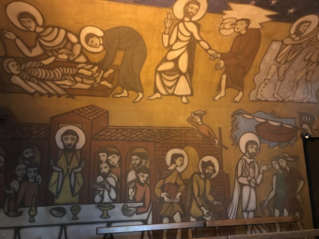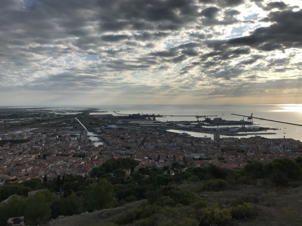Our first excursion gave us a little introduction to the port city of Sète, famous for octopus, red tuna and water jousting! It has a picture postcard port, the biggest in the French Mediterranean as well as an 8th century fortress which is now an open-air theatre. The little canals stored the jousting boats with blue ones for married men and red ones for singletons! We visited Mont St Clair for a stunning view over the city and out across the Mediterranean Sea, just a shame that the clouds hadn’t lifted yet and the sky was still grey. The little church at the lookout had a fascinating mural painted inside, not like anything I’d seen in a church before.