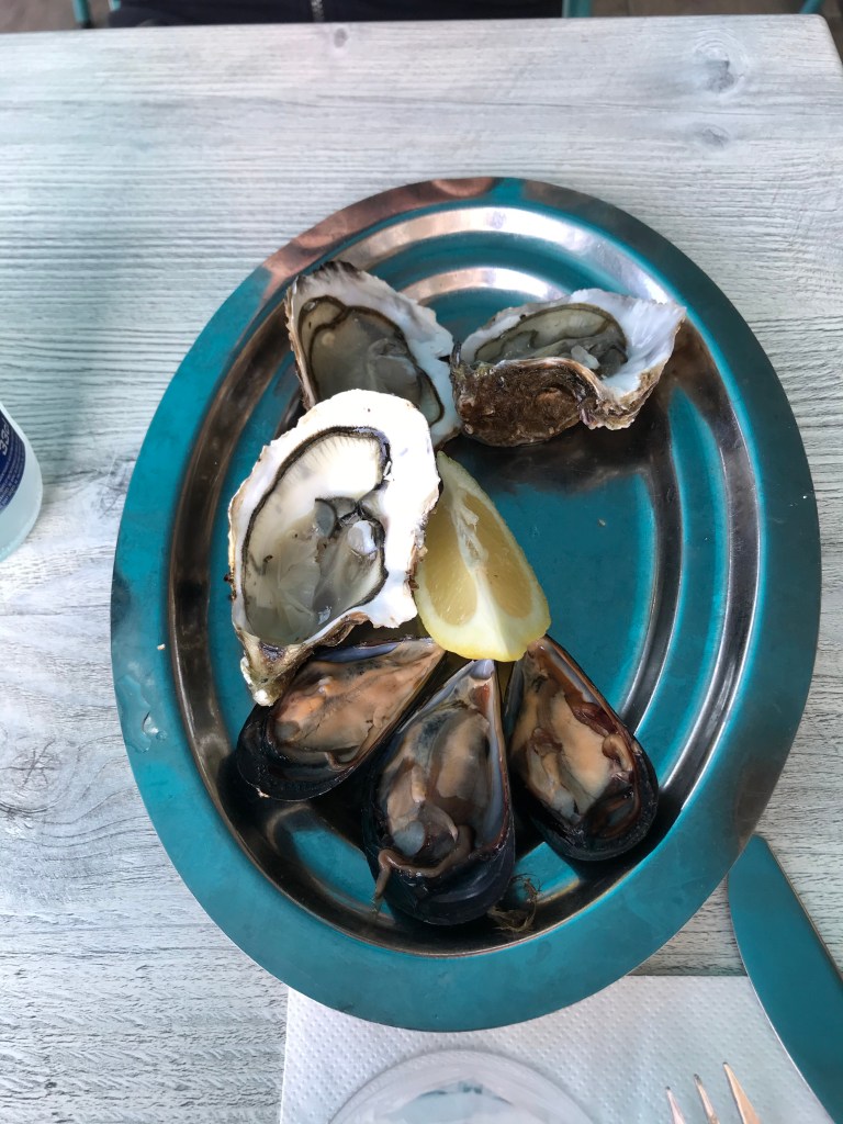 Coming back down to sea level, we visited a museum about the area and its fishing heritage. A lot of it was in French but our guide translated and gave commentary in English. The museum showed different methods of oyster and mussel farming since the 1920s, which I found really interesting. Most of the farms in the area as still very much small, family run businesses, but like most things nowadays, it’s a dying trade not attractive to younger generations. After the museum, we went to a local restaurant to sample some oysters and mussels. It’s been years since I’ve had oyster and I’m still not sure what all the fuss is about. I tried them anyway!