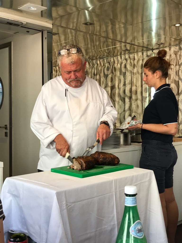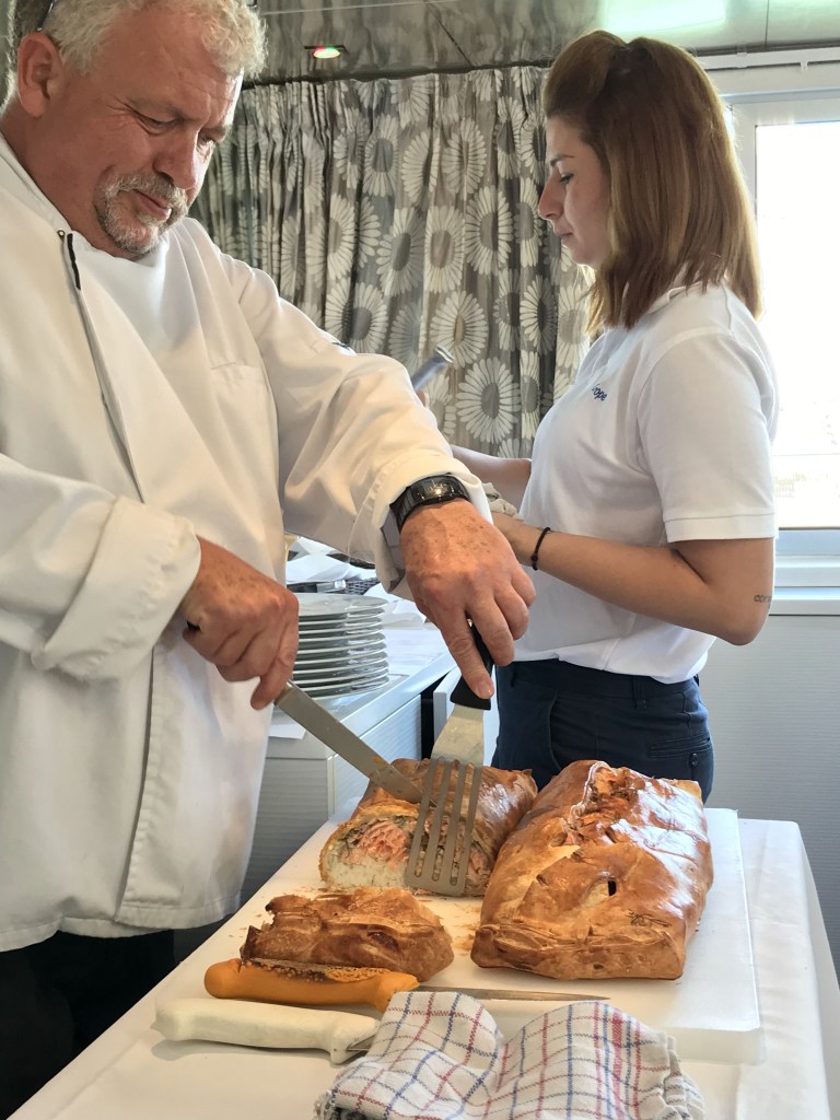 Lunch was always a bigger meal with larger portions and the cheese course which I thought was a better way to serve the meals. Dinner portions were smaller but we were never hungry! In fact, it was a good thing that breakfast was simply fruit, toast, cereals and pastries with a small selection of eggs to order as it stopped the boat from capsizing with all the extra weight we were carrying!