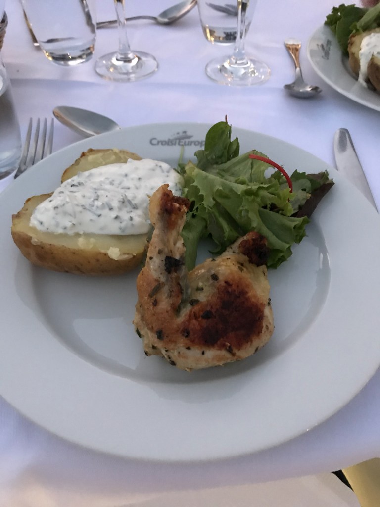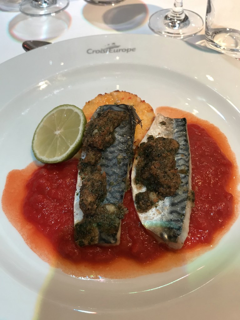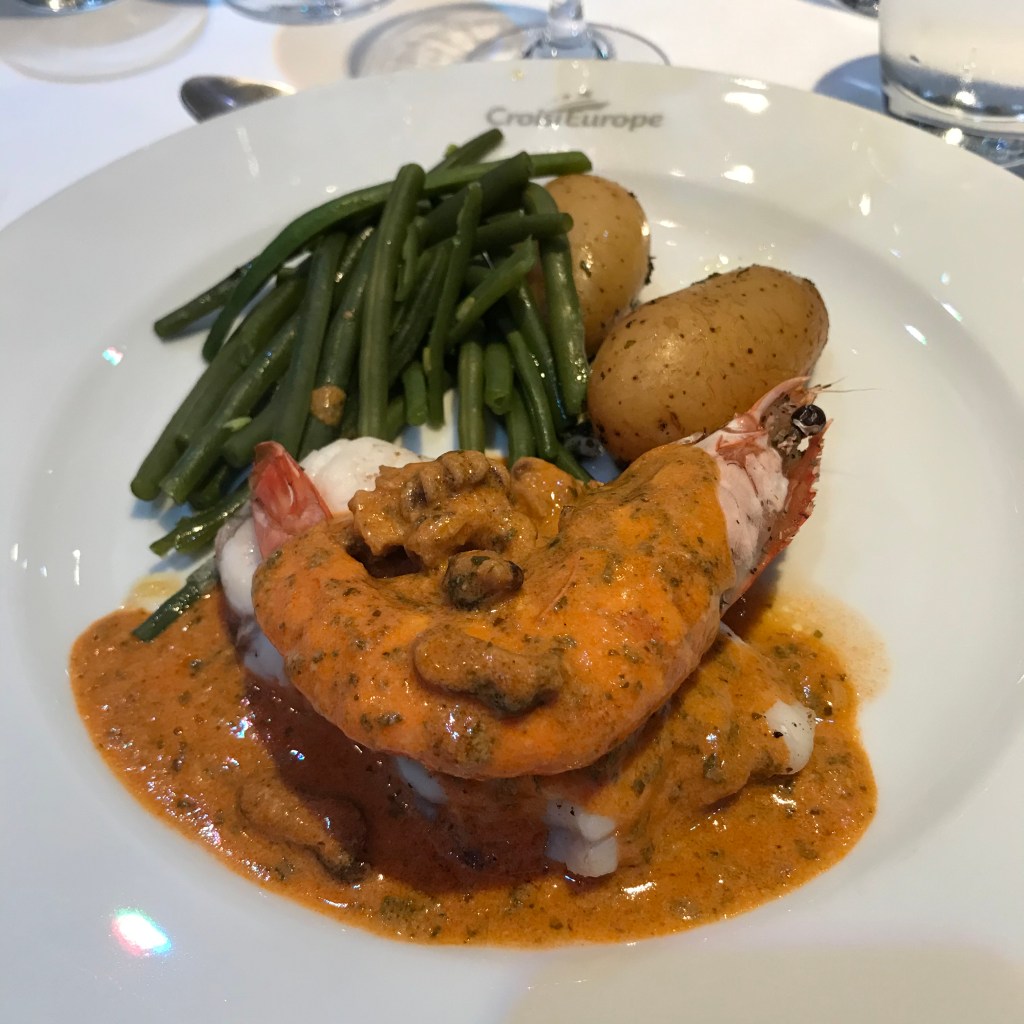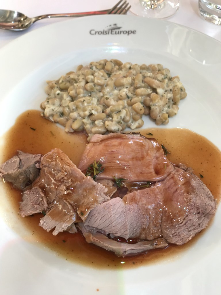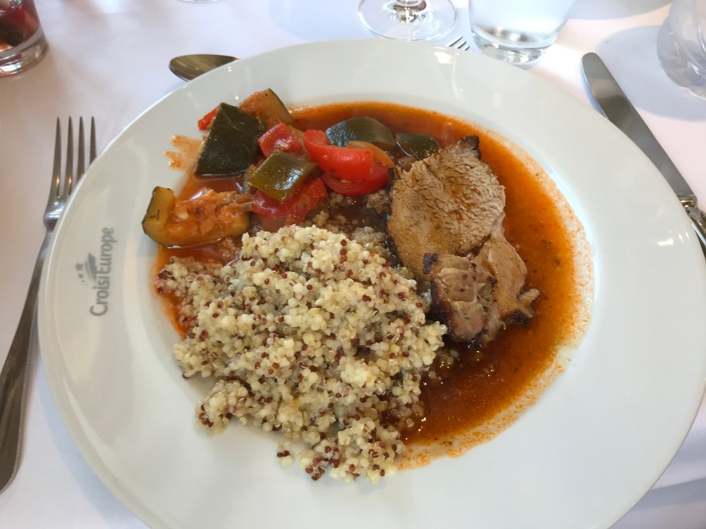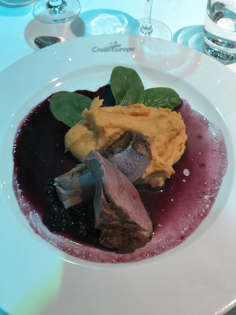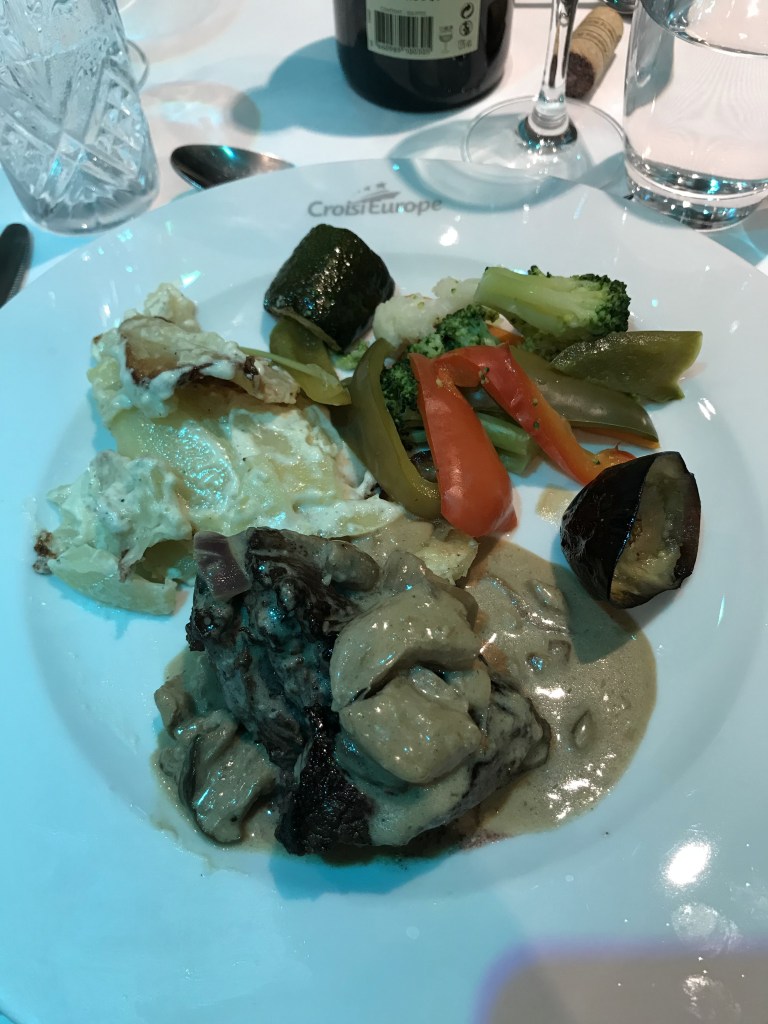 As it was late, we had a quick Champagne reception and sat down to dinner at 2120. The MS Anne-Marie is operated by Croisi Europe and was built in 2014 so it’s quite a modern ship. The dining room and bar force you to speak to the other passengers and sitting for dinner was a nervy affair; like not being picked for PE at school! I was more tired than hungry but the gazpacho, duck and roast potatoes followed by ice cream went down pretty well! Helped by a generous amount of delicious French wine. Plans for a quiet evening went out of the window as me & the other half sat on deck in the warm night air getting to know our shipmates until past midnight!