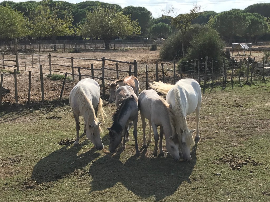 The Camargue is not only known for its bulls, but also its white horses. It used to be that the horses were wild but most are owned nowadays. We were given a tour of the farm on the back of a trailer and met some horses and foals. The horse’s fur starts off grey and turns white by around 4 years old. After the ride on the trailer, were given a demonstration of bull sorting but it wasn’t as high octane as I wanted!