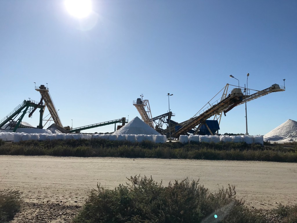 After exploring the town, we boarded the coach to take us the short distance to the salt marshes. The marshes cover an area about the same size as Paris and use a cleaver filtration system from the salt and fresh water. The water is pink from algae, but there’s no flamingos here like there are elsewhere in the Camargue as there’s no shrimp for them to eat. We saw huge mounds of salt, grey for roads and white for table. You can taste the salt in the air and on your lips as the little train takes you around the site.