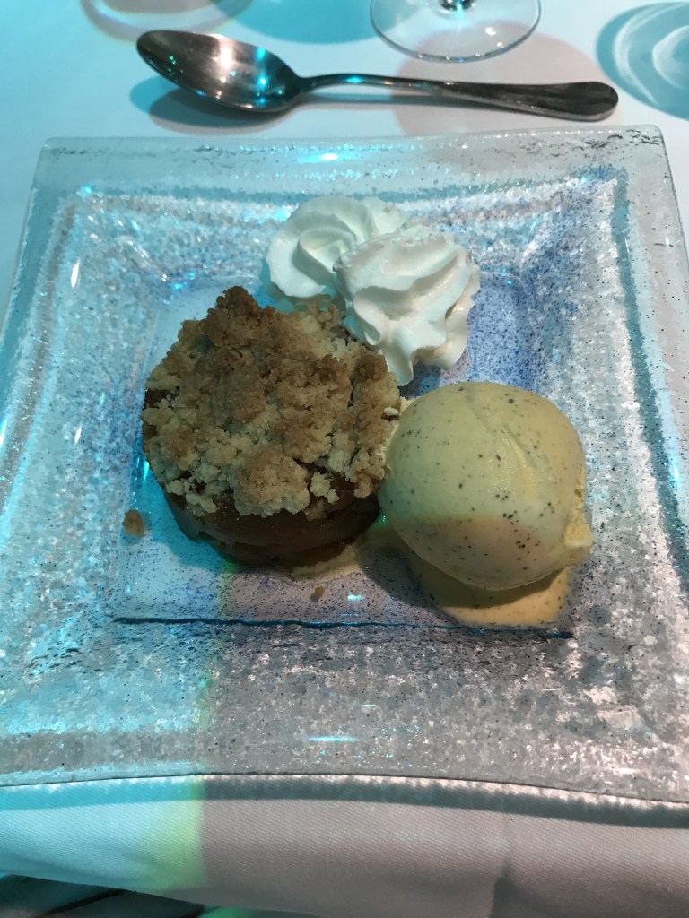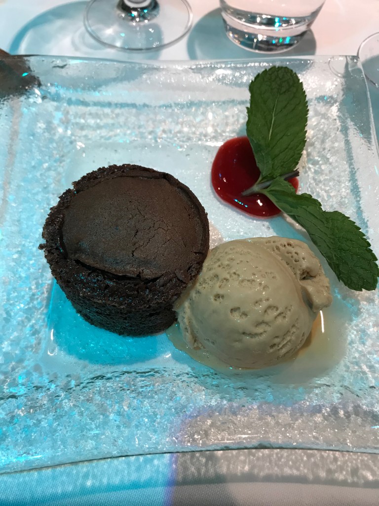 Back to the ship for our Gala Dinner, I declined the starter of foie gras and had avocado instead. I’m not really a fan of avocado but it was pretty good with the balsamic glaze. The main course of rib eye steak was incredible, cooked perfectly to each person’s individual specification – mine medium and the other half’s well done. The melt in the middle chocolate sponge was the perfect ending to a special meal.