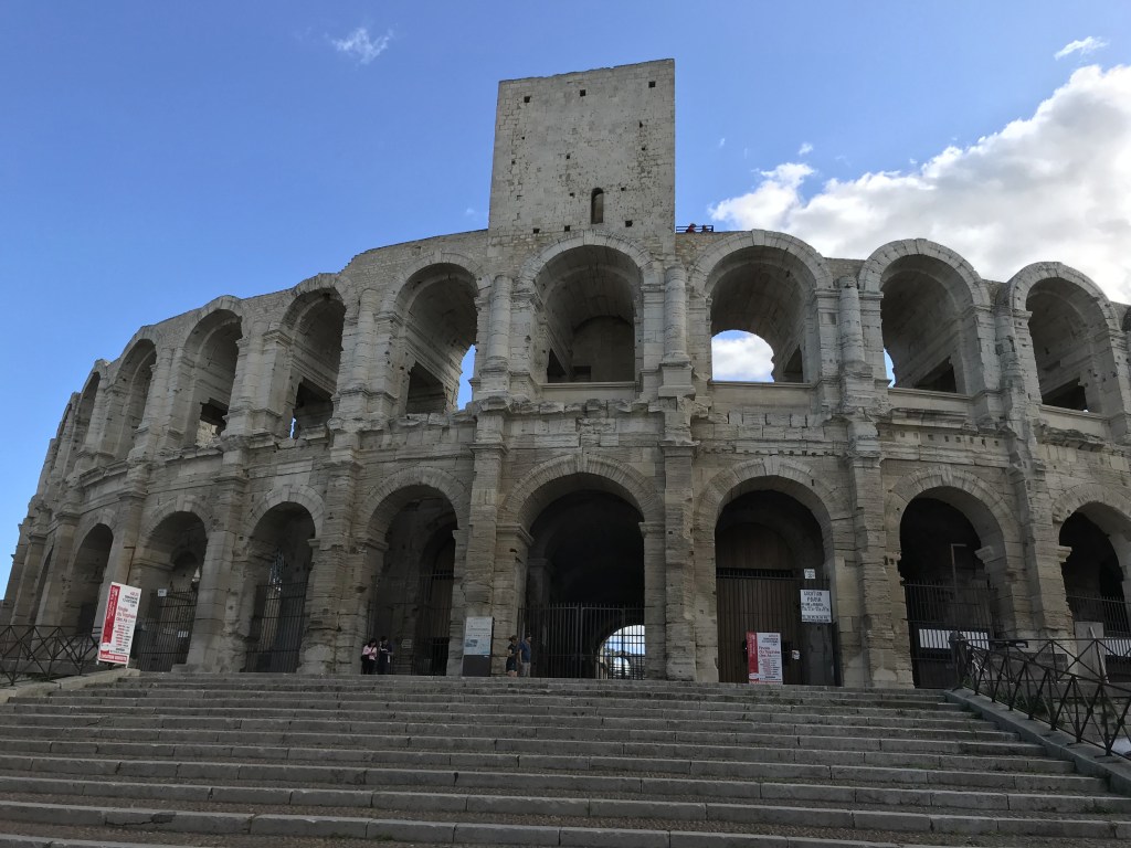 Arles is the biggest city in France, it covers about 70,000 hectares! After a tour of an olive oil producer, we spent the afternoon wandering its little streets and roman amphitheatre. The olive farm and factory were arguably more interesting, but that’s personal preference. I enjoyed learning about the 4 varieties of olive and oil that they produce and their protected statuses. We were on the farm during harvest, which doesn’t usually start until mid-October but it was starting early due to the hot weather. I loved how the trees are shaken with machines to release the olives which are then washed in a jacuzzi. The olives are crushed and oil is extracted from the paste by centrifuge. The oil then sits for 2 weeks before it is filtered and has flavours added. Fascinating!