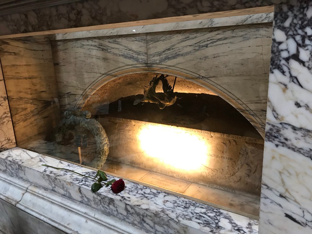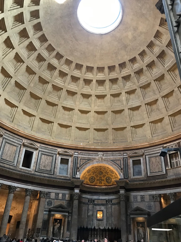 The hotel was about 100m from the Trevi Fountain but the crowds made it hard to get a decent look at it so we headed off for a walk around town to get our bearings and see some historic shiz. We walked for miles, first stopping at the Pantheon, a Roman temple some 2000 years old! I’m always blown away but the size, scale and ingenuity of these buildings when you realise how old they are. The Pantheon is still in great nick, having been rebuilt a few times after fires, with the current structure thought to date back to 120 AD! It was pretty cool to see the monument to the famous Renaissance artist, Raphael and I loved the design of the roof with a hole in it.