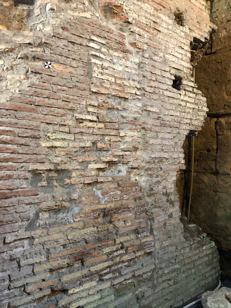 Our all access tour took us underground where the animals were kept and corridors linked to the gladiator barracks. You could see the construction methods used with some arches not cemented and others built using cement made from volcanic sand. After exploring underground, we took a brief walk around the exhibits within the second-floor tier showing artefacts discovered during archaeological digs over the years before ascending via a private gate to the third tier.