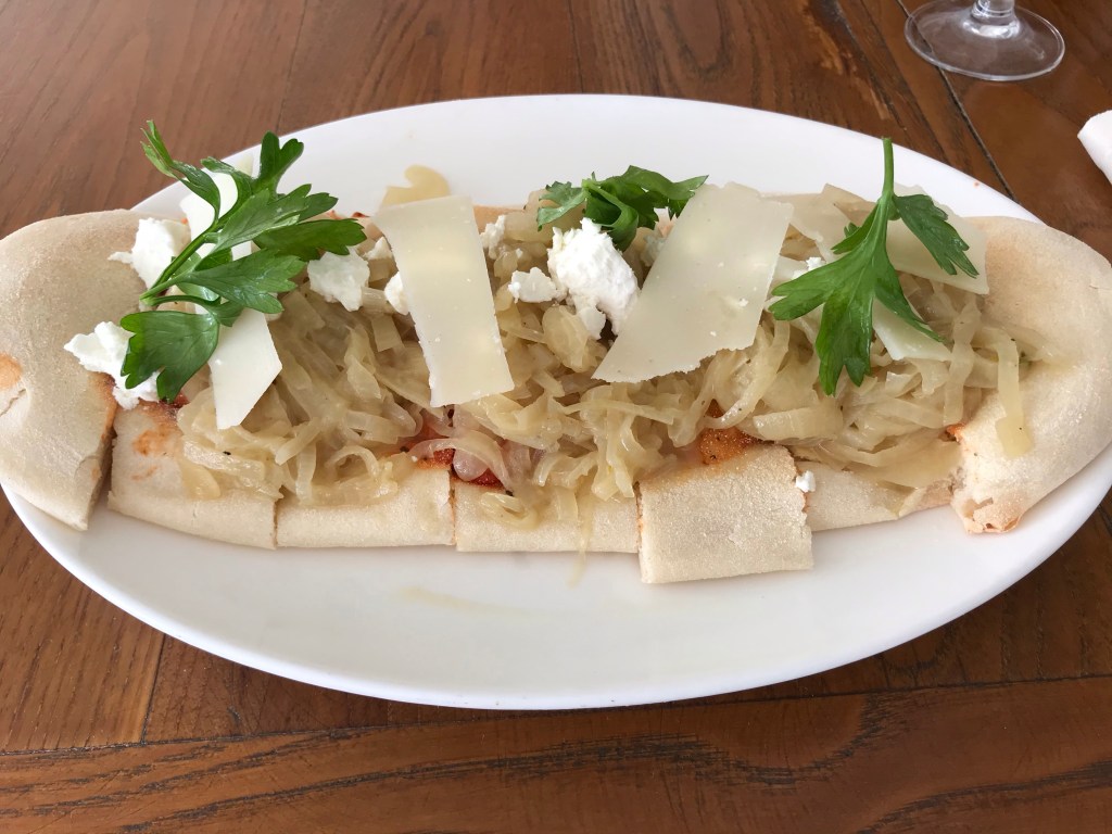 Flatbread flavoured with French onion soup, goat’s cheese and tomato sauce at Provence