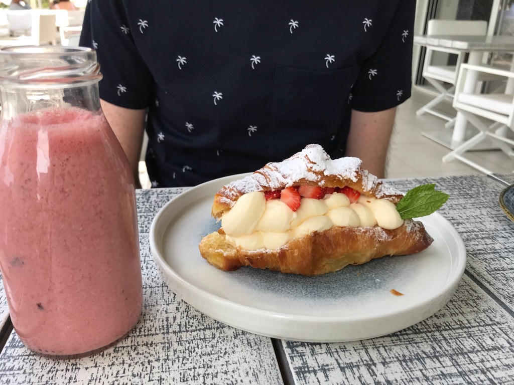 Croissant stuffed with vanilla cream and strawberries at Ouzo
