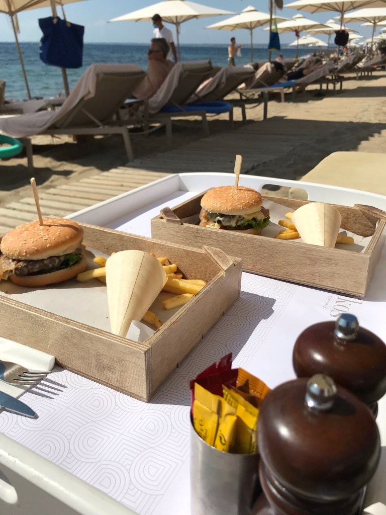Ikos beef burger with cheese, bacon and Gouda at the beach bar