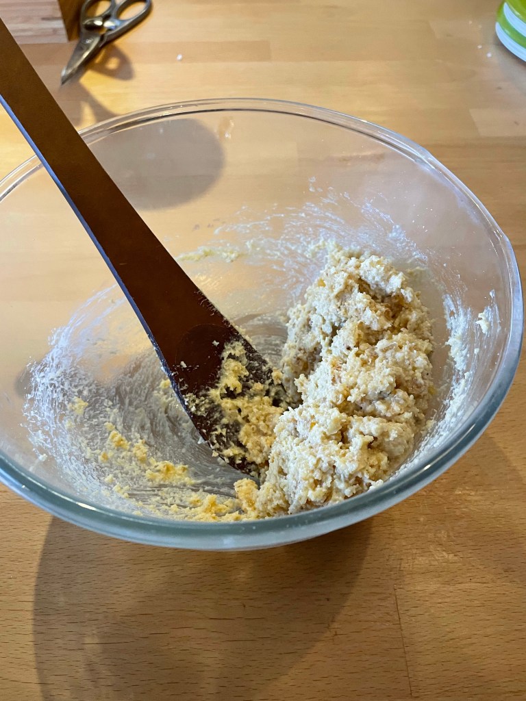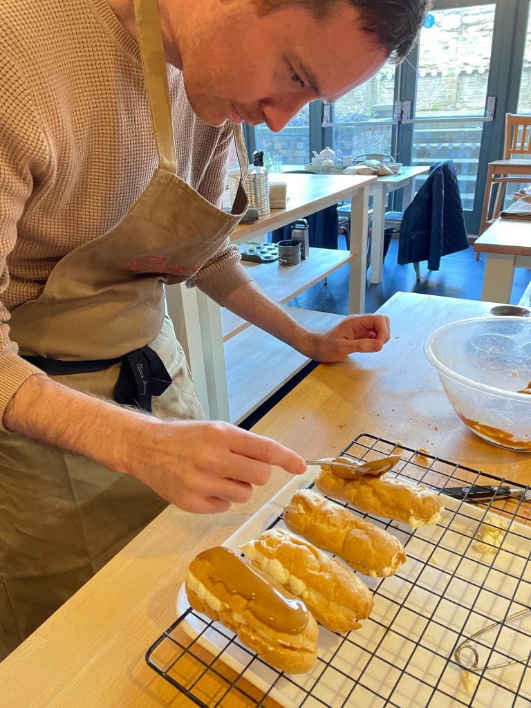 After a cup of tea and an introduction to the kitchen, we cracked on with our bakes; an apple and lemon curd cake, eclairs and stollen mince pies. I must admit to have been a bit nervous, particularly at the thought of making choux pastry, but Gilly was so calm and reassuring, she made it all seem so easy!