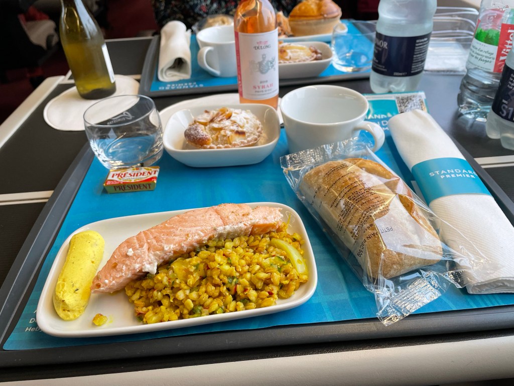 We boarded about 30 minutes before departure and lunch was served within about 20 minutes of leaving Paris. I had salmon with a turmeric gloop and mum had a goats cheese pie. Both were fine but I enjoyed mine more than mum liked hers. The apple and frangipani tart was delicious but would have been so much better with some cream!