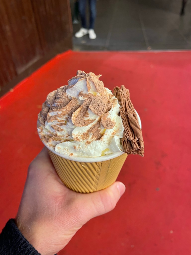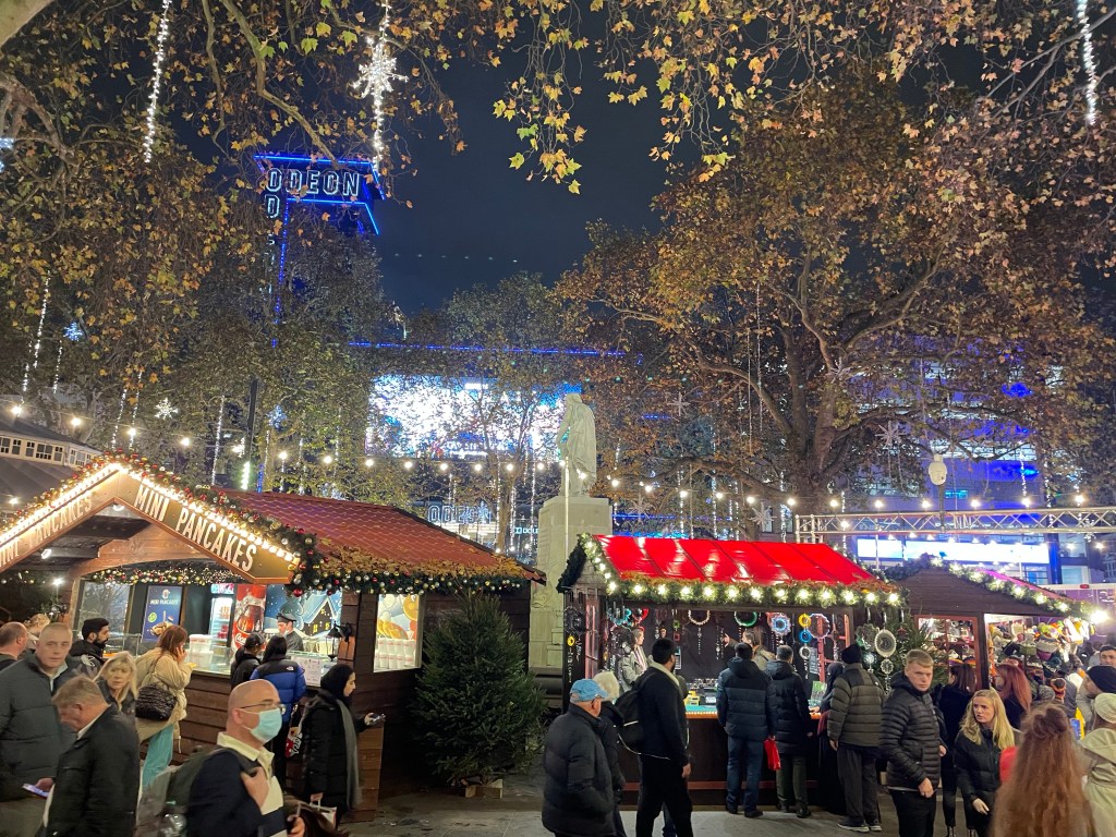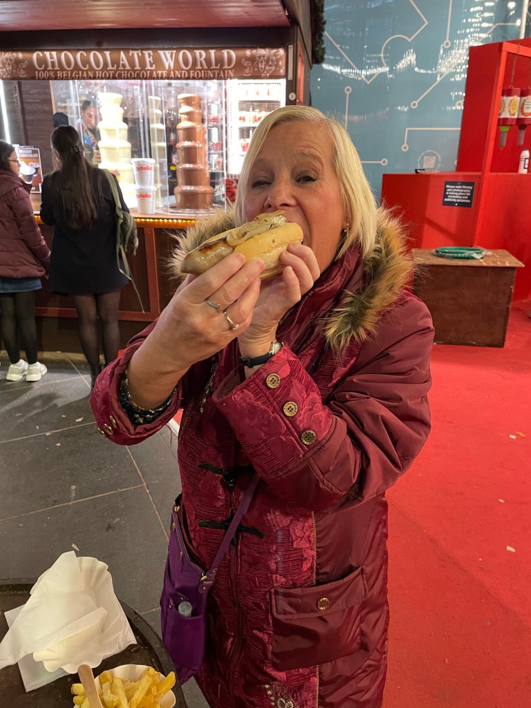 Once the tests were done, we headed out to Leicester Square to see the little Christmas market. Getting in to the festive spirit with bratwurst, mulled wine and hot chocolate. Mum loves a Christmas market and seemed to enjoy checking out the stalls.