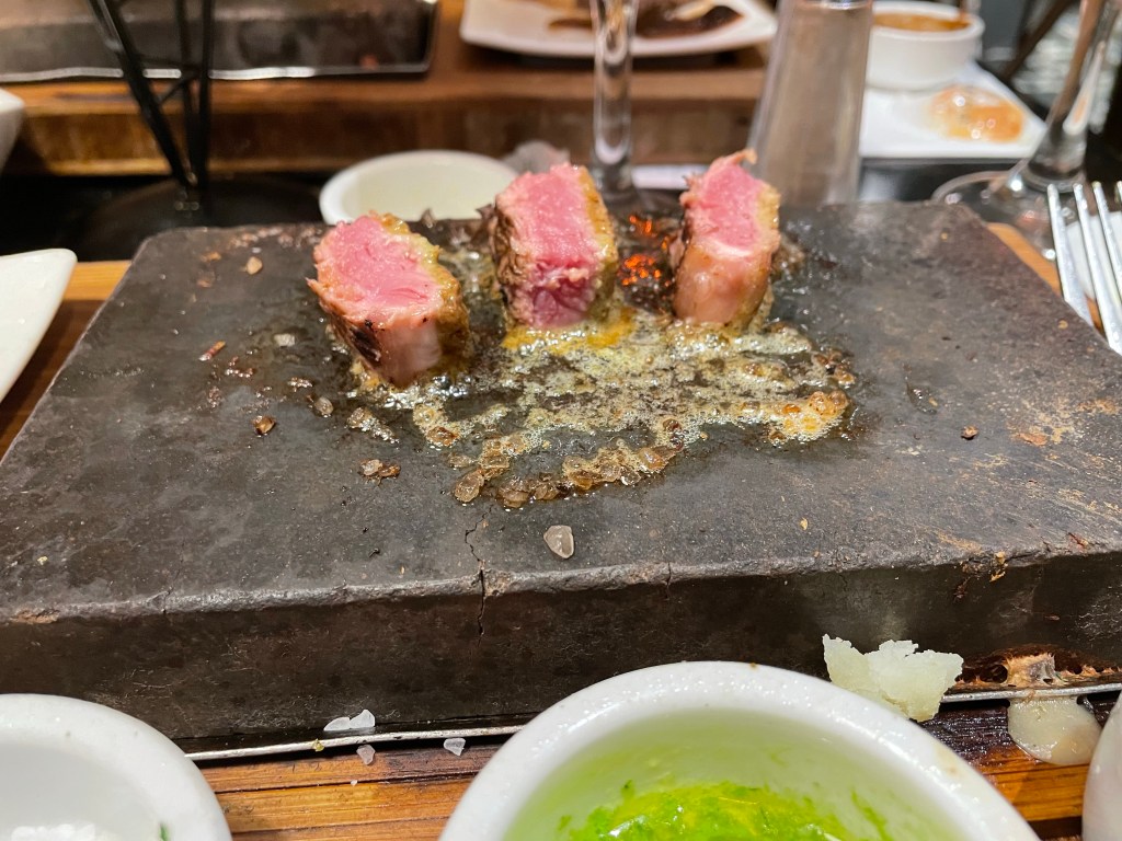 Our server was very attentive and explained the concept when we asked why we hadn’t been asked how we wanted our steaks cooking. Cooking on the hot stone was a lot of fun! We got in to a little process of pre-cutting all of our meat before cooking it, cutting up the veg and nibbling on an onion ring whilst it cooked. Once it was ready, a bit of meat, a bit of veg and a dash of sauce. Delicious! The only negative is that your clothes stink afterwards!