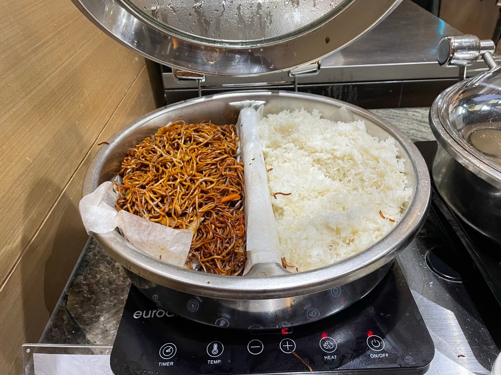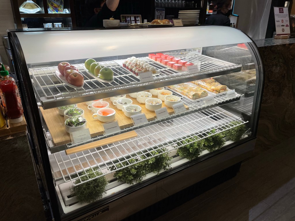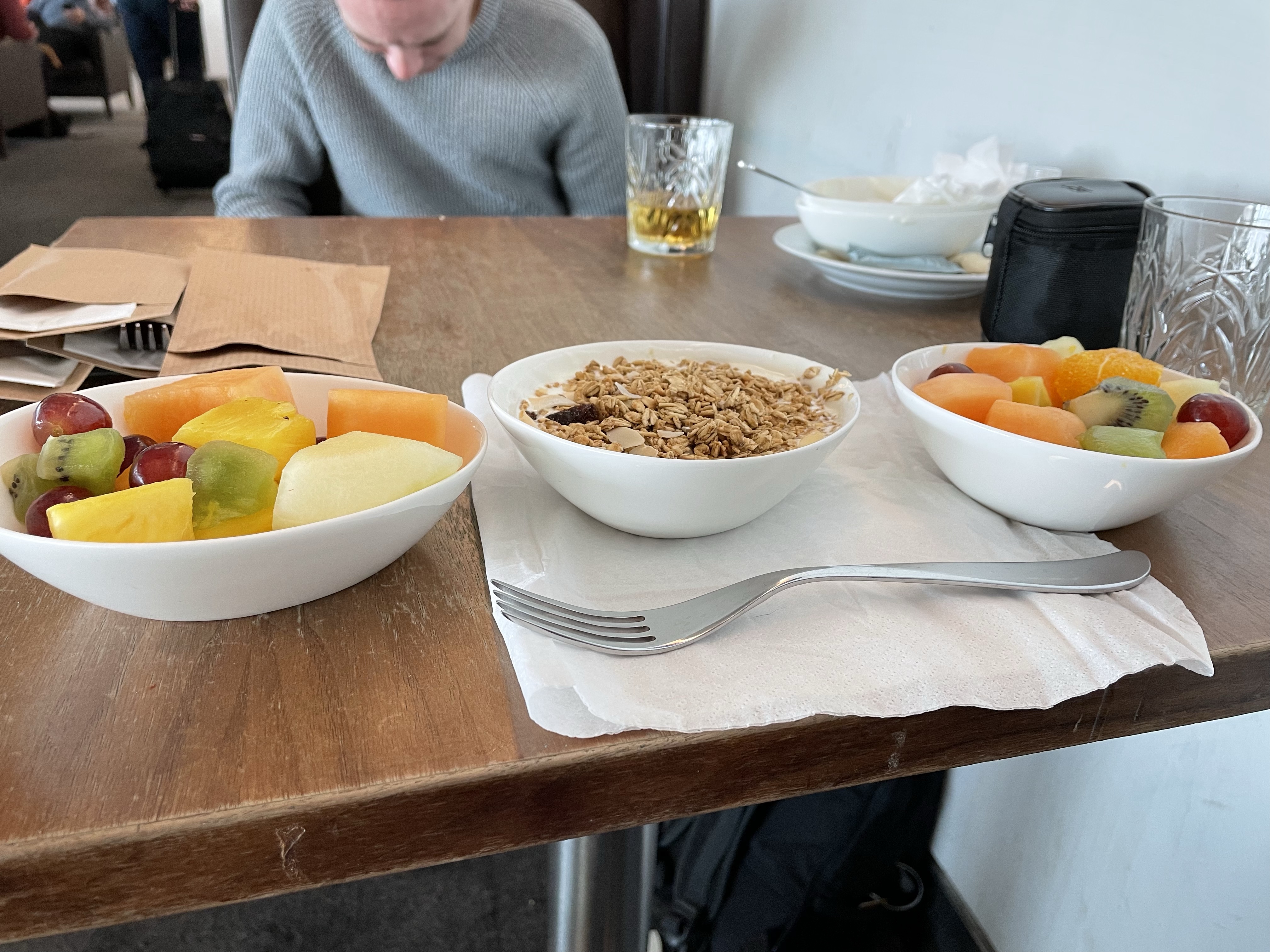 Having tried both Galleries North and South during my Bahamas trip, I’d learnt that Galleries South was my favourite lounge so we headed there for breakfast. The lounge was busy but we managed to get a table for 2, not too far from the windows so we had some light. Man, this place is grotty. I bet there’s Travelodges in better shape. The furniture is worn, with bits hanging off it, the walls are all scuffed with food spilled down them. The cups and glasses were dirty, even after being put back out, and the staff couldn’t bring them out fast enough. I get the volume of traffic through this lounge, but there’s really no excuse for how shoddy everything is. It’s embarrassing. I would say that the quality of the food was better than last time, although I over ordered on fruit!