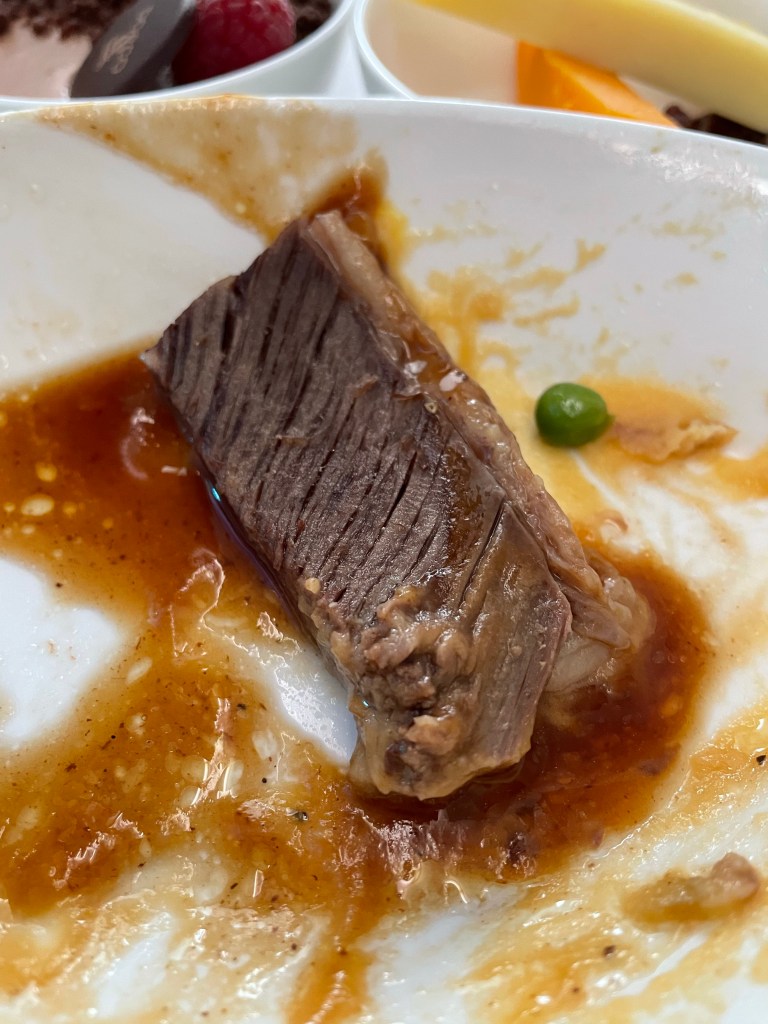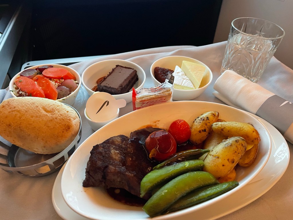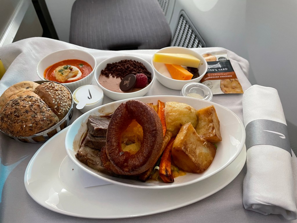 Lunch was really good. The Do&Co caterers did a good job! I wasn’t a huge fan of the red pepper cauliflower but that’s not to say it had a bad flavour, it’s just not my kind of thing. The beef rib, however, was one of the best meals I’ve had on a plane. A nice sliver of beef fat added to the tenderness. And the yorkie pud, it must have been cooked with butter, it was delicious. My only gripe is it being served on one tray, which most airlines have stopped doing already. Good ol’ BA, behind the curve! I was worried the main would be cold by the time I’d eaten the starter, but it was just hot enough. The dessert was also excellent. I loved the raspberry coulee along the bottom of the dish.