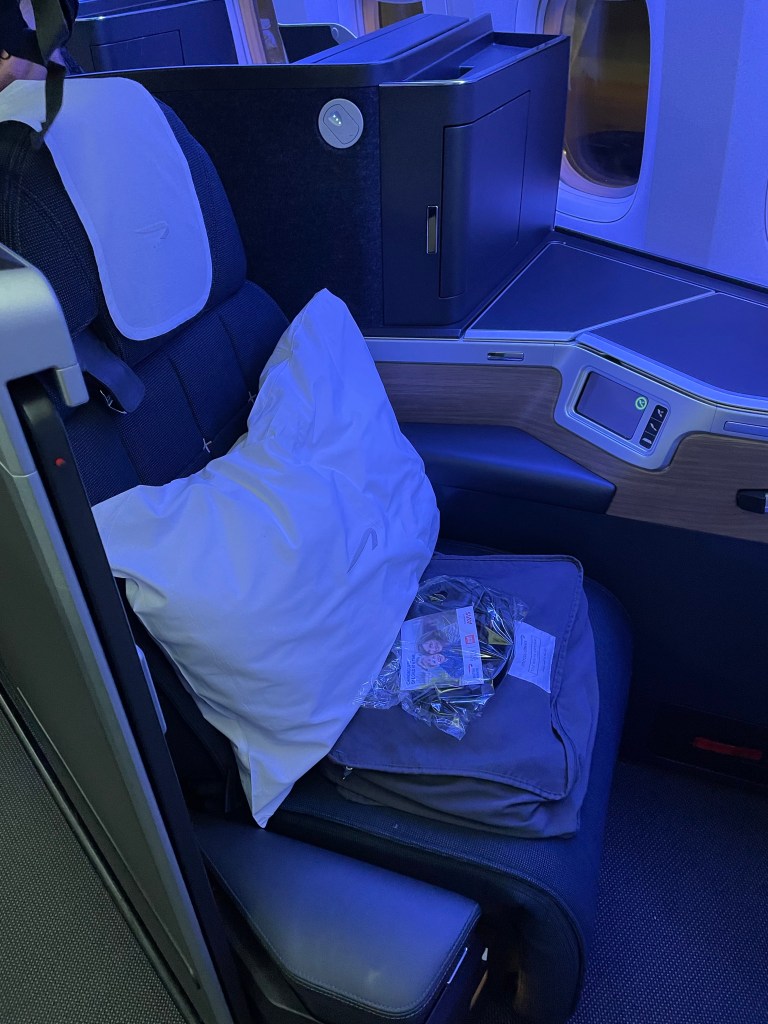 We caught the transit train to B gates and boarded at about 1105. I was intrigued to be trying out BA’s “old” Club World as had always read about how it hadn’t aged well and lagged behind what other airlines were offering nowadays. Not many airlines still have a 2-3-2 configuration in business class, for example, and I’ve been spoiled by Qatar Airways! Even the worst airline I’ve ever had the displeasure of dealing with has a 1-2-1 config. It’s actually weird to think that this seat was revolutionary when it was debuted in 2000, although the seat we had was second generation and came out in 2006. This interesting article on Executive Traveller chronicles its inception.