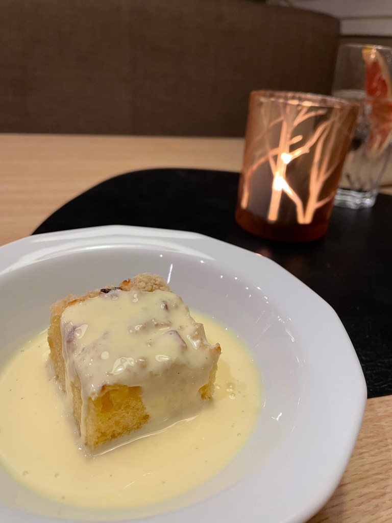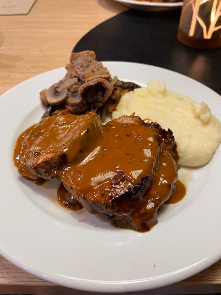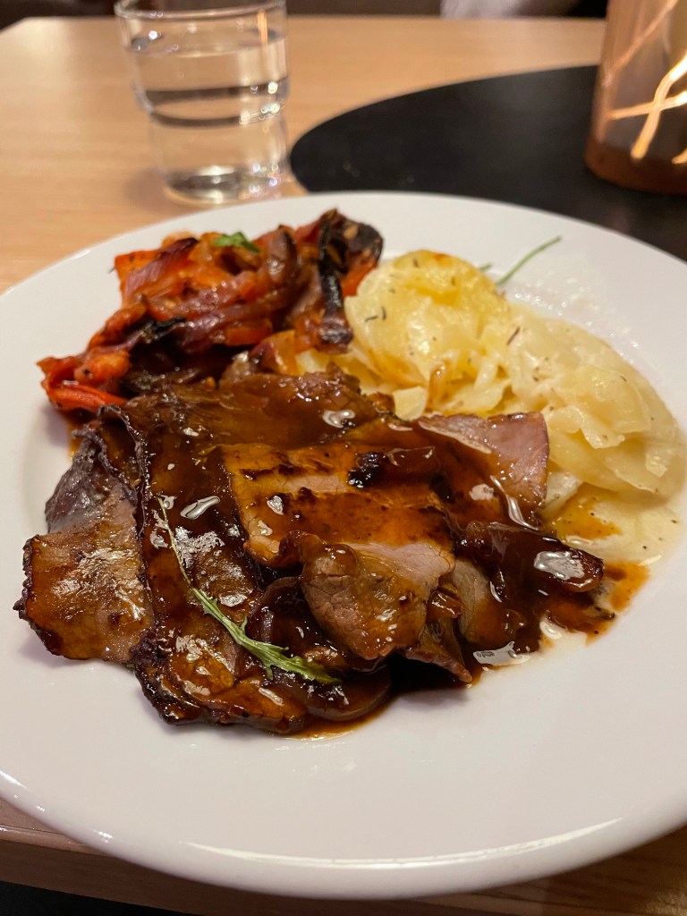 The salmon in bernaise sauce was absolutely delicious. The salmon just melted in the mouth, so lovely and soft. The pork stew was also really good and the thinly sliced roast beef in red wine sauce and garlic potato gratin were stand out dishes. The highlight pudding was definitely the cheesecake. The blueberry cake was good but a little dry around the edges.