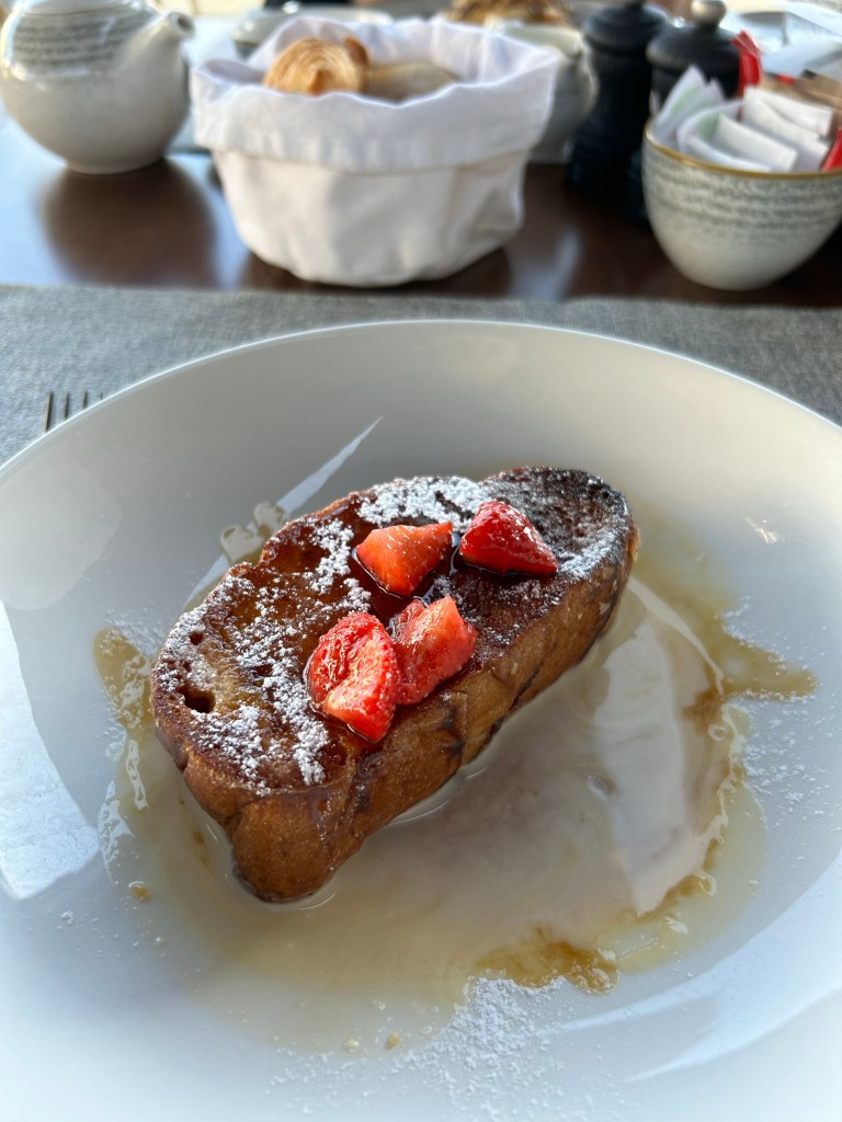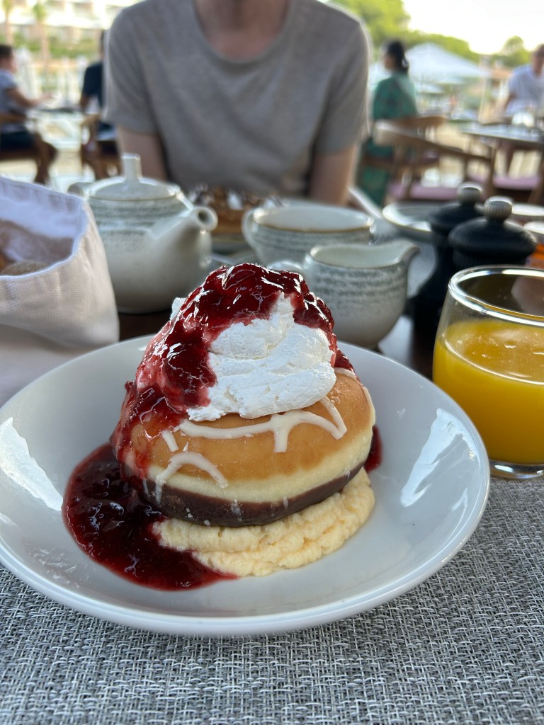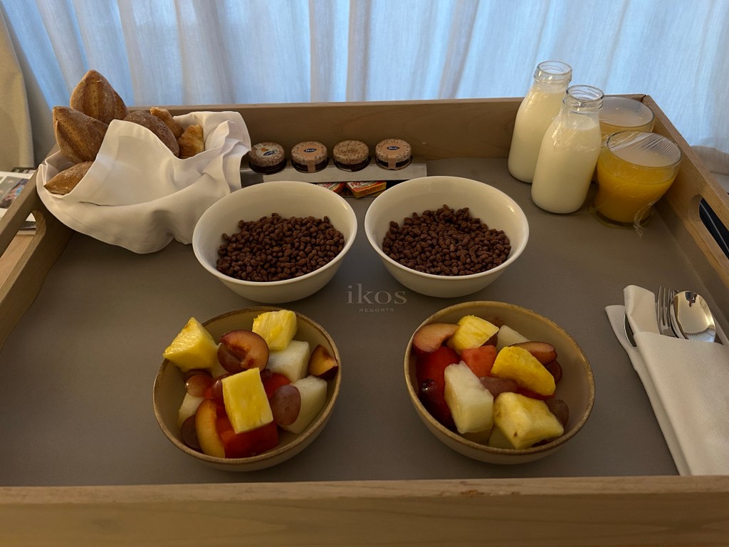 Considering the size of the resort, there’s fairly limited options for breakfast and lunch. We only stayed 5 nights and ate at Oliva (Spanish) and Fresco (Italian) twice each for breakfast as well as The Market buffet and room service on our last morning. The food is the usual spectacular standard you would expect from Ikos. Pancakes, waffles, brioche French toast and not to mention the huge cream and jam donut – all devine! Fresco was our favourite place for breakfast although I am devastated that the cream stuffed croissants I have loved from previous Ikos stays weren’t on the menu. There are healthy options (see, there’s fruit in the picture!) as well as bacon, eggs, sausage if that’s more your thing.
