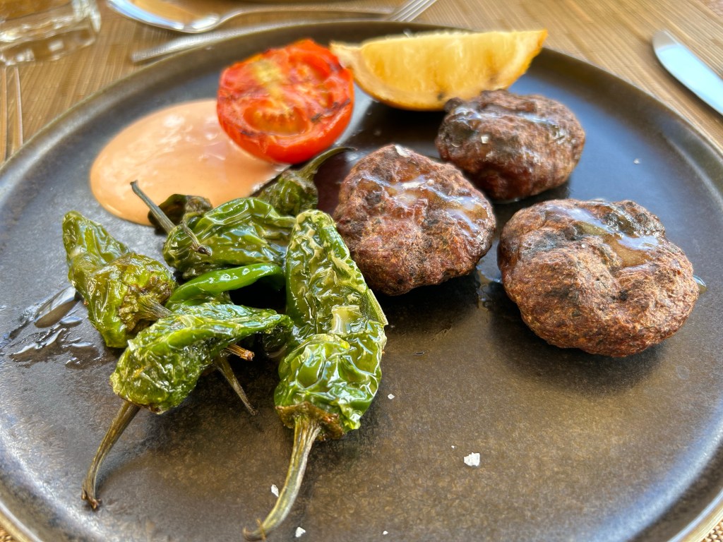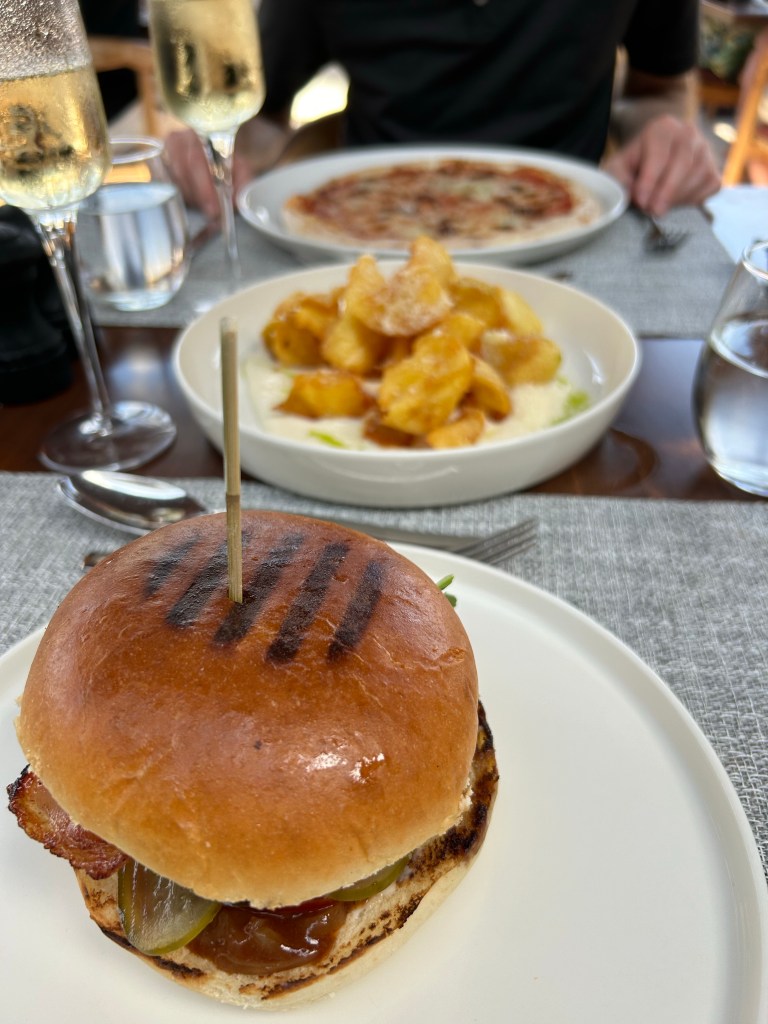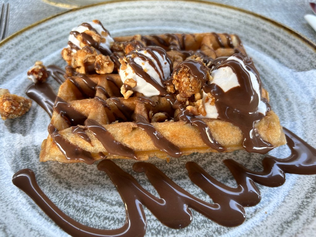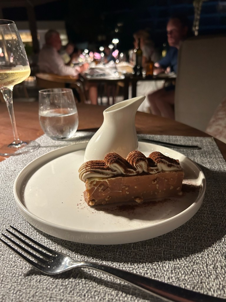 Lunch at Fresco gives a choice of a la carte or BBQ. The BBQ was better in range of options and flavours than we’d experienced at any of the other Ikos hotels, with pork, ribs, chicken as well as fish and seafood. Because of the two menu options, you could treat it as two separate experiences and there’s plenty of choice. The Parmesan roast potatoes were incredible and plenty big enough to share between two. Not quite sure why they’re on the menu as a starter, they’re more like a side. The pork chop was so tender, it just melted. The Parmesan bacon burger was also excellent although the sauces made the bread so soggy I couldn’t really eat it. Delicious, nonetheless!