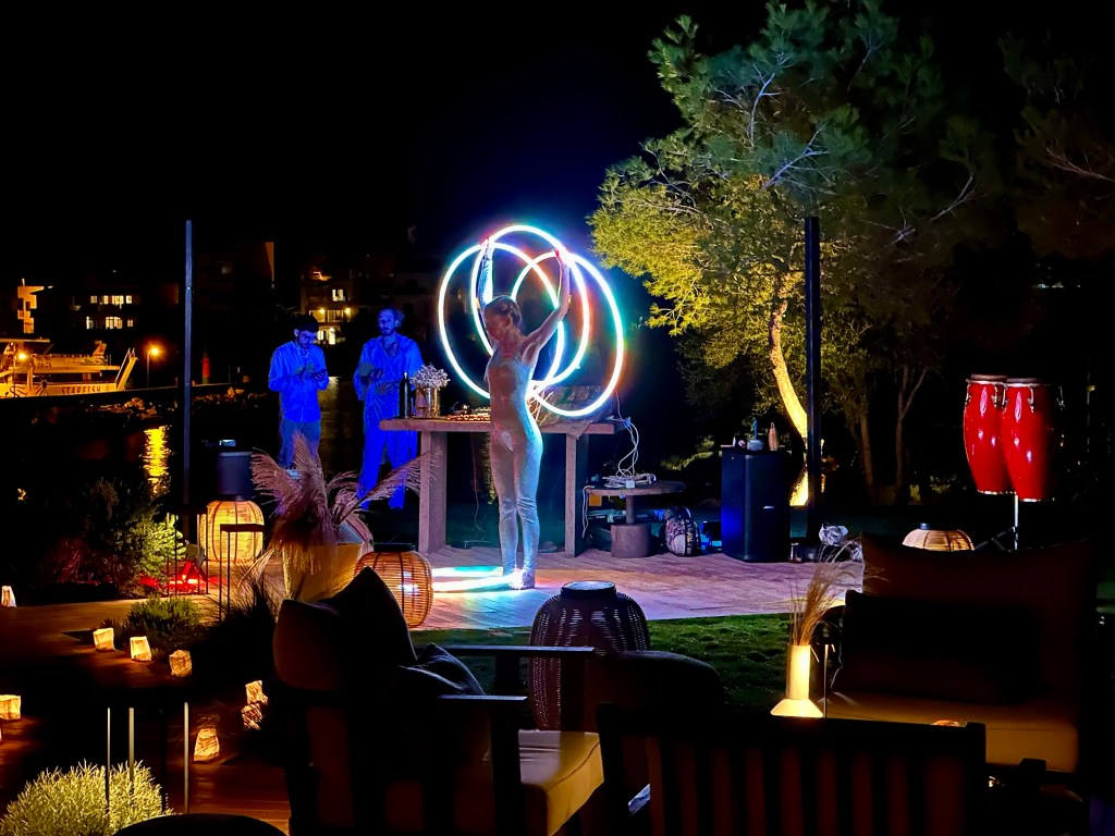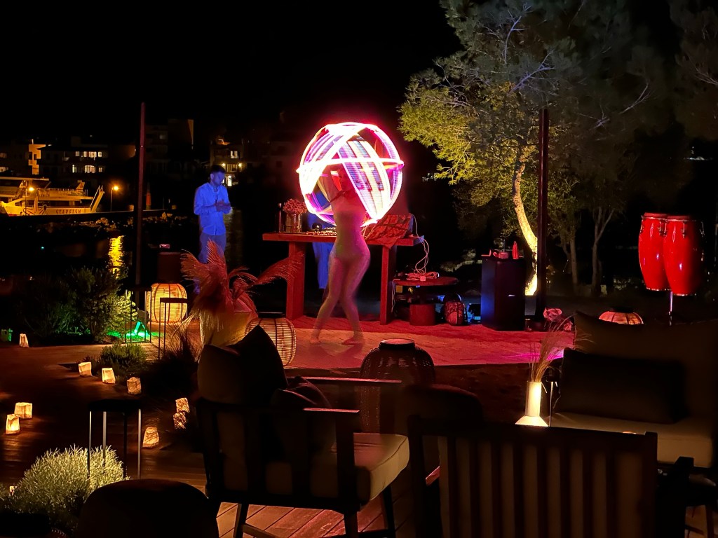 The Ikos (and Sani) institution White Party happens on a Wednesday in the Porto Petro bar. We look forward to the White Parties but found it a bit lacklustre. I think because it’s in a normal bar and not a special area like it was at other Ikos hotels, it didn’t feel that special. The hula hoop woman was entertaining but the hippy DJ played some odd tunes which I don’t think resonated with people. The DJs in the other bars were great and added to the chilled out vibe around the pools. A little leaflet with the day’s activities was usually on the table at breakfast so you could plan if you wanted to catch one of the DJs or some of the other entertainment. The concierge will also send a link to the google drive with handy info via WhatsApp so make sure to have a read and make the most of your time at the resort.