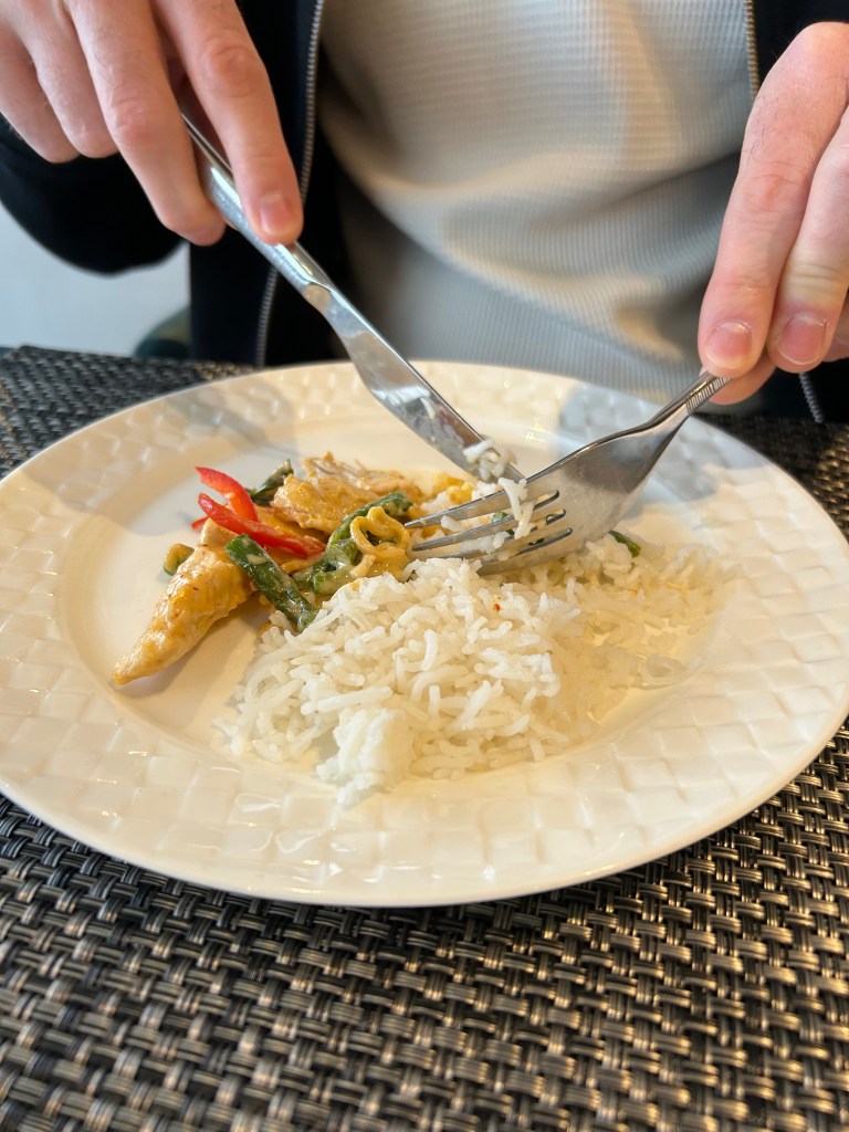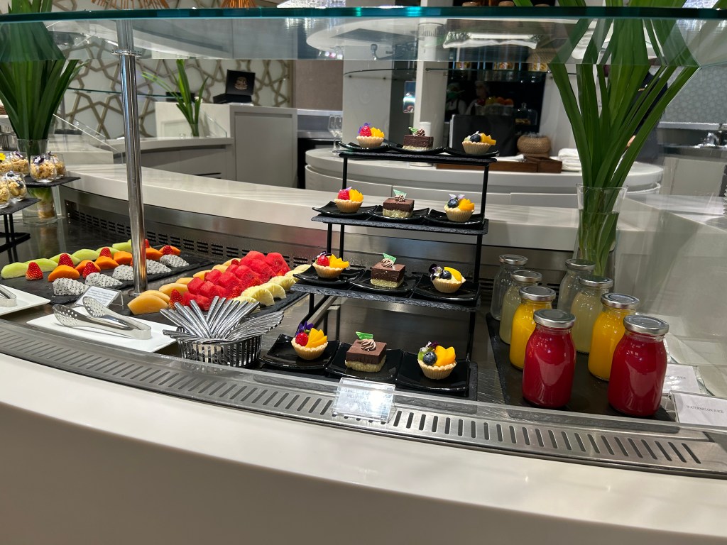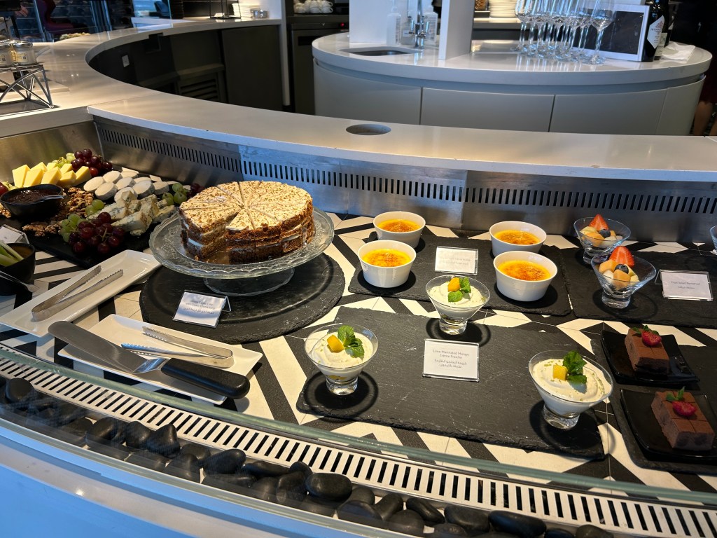 The lounges have an extensive hot, cold, soft and alcoholic drinks menu and fridges where you can help yourself. Heathrow had self pour wines, but I didn’t notice them at Bangkok, possibly due to Ramadan. I enjoyed a glass of Joseph Perrier champagne and both lounges had plenty of choice from the buffet or you can order from an a la carte menu by scanning the QR code on the table. At Heathrow, I had an excellent steak and the other half had Thai green curry, to get in to the holiday spirit. At Bangkok, we kept it light with a few cold cuts from the buffet and an avocado salad.