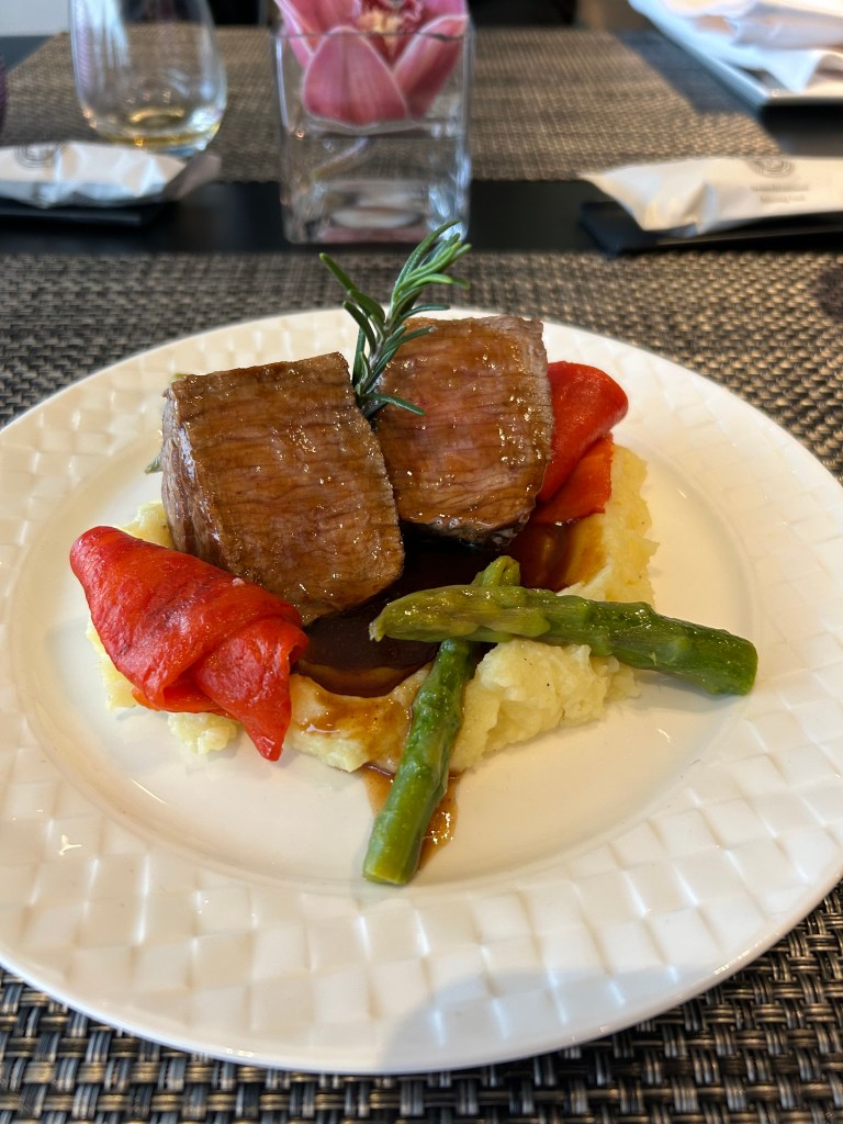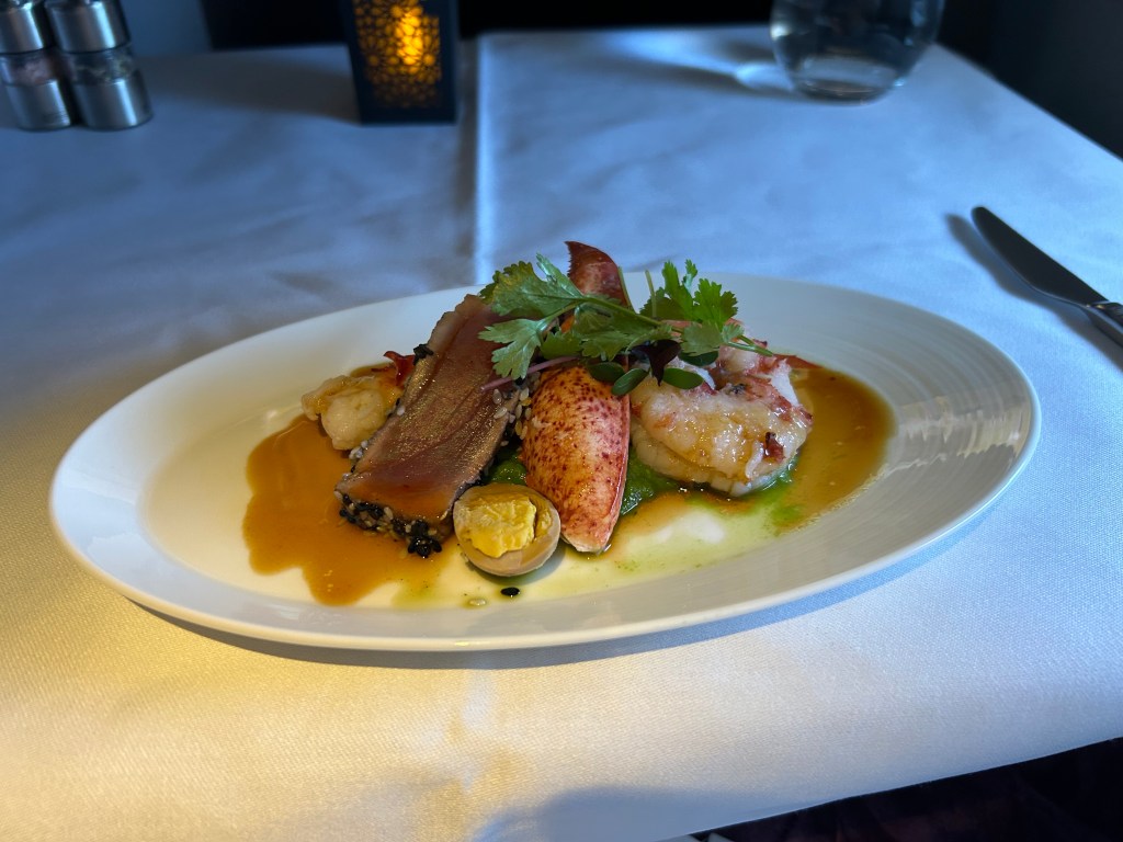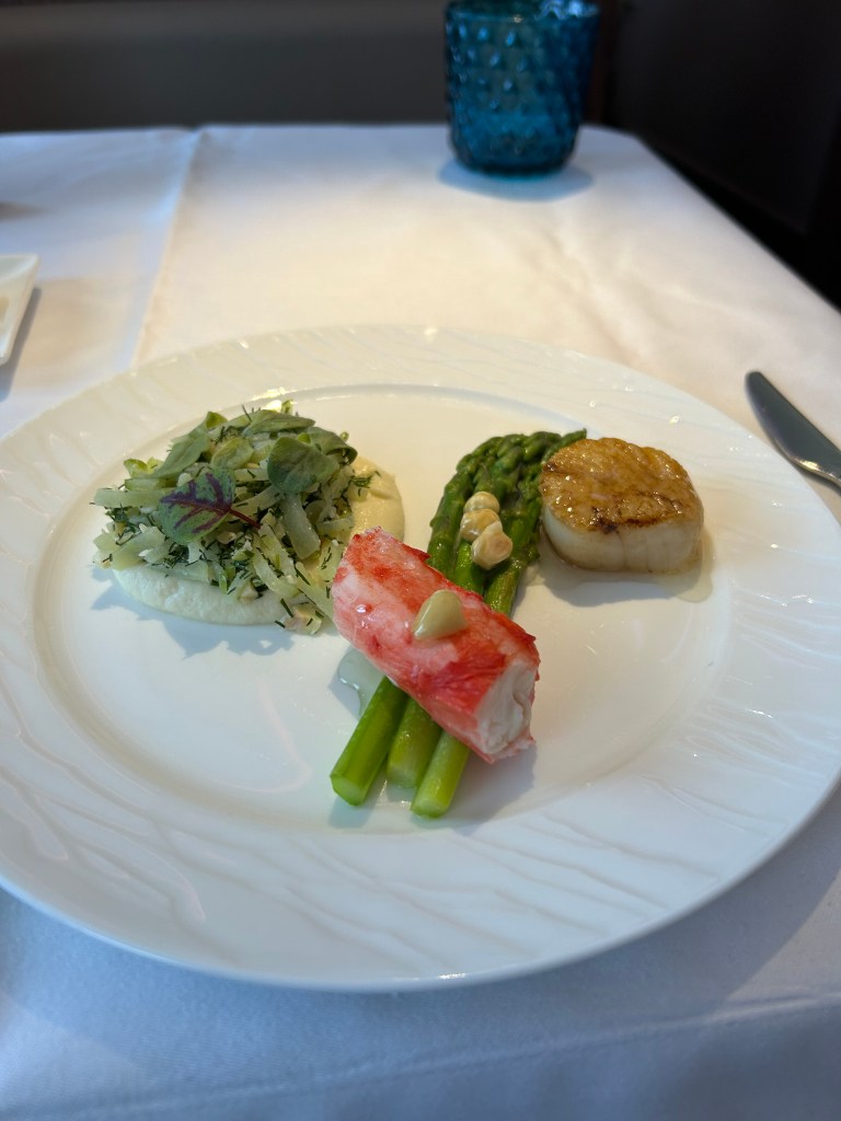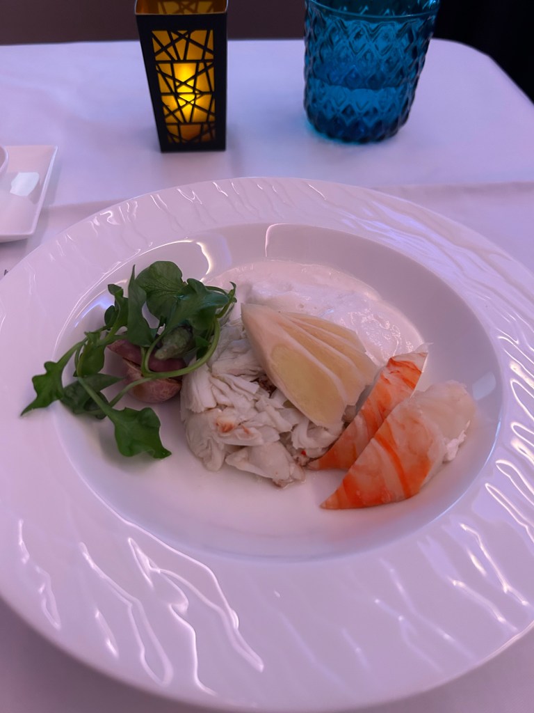I’d picked a crab starter again and it was absolutely delicious but the lobster again, was really bland. Maybe it’s my, or maybe it’s just not a great dish to serve in the air. The coconut cream, however, was incredible. Not sure what the veggies were on the side but let’s say that they, erm, weren’t to my taste.