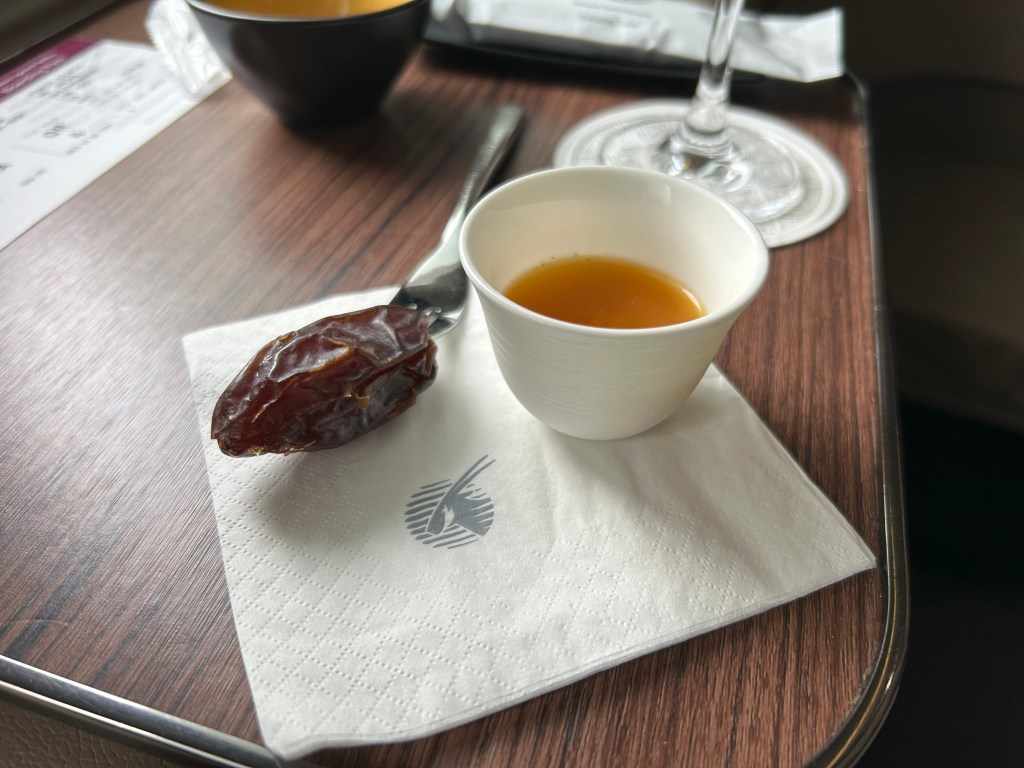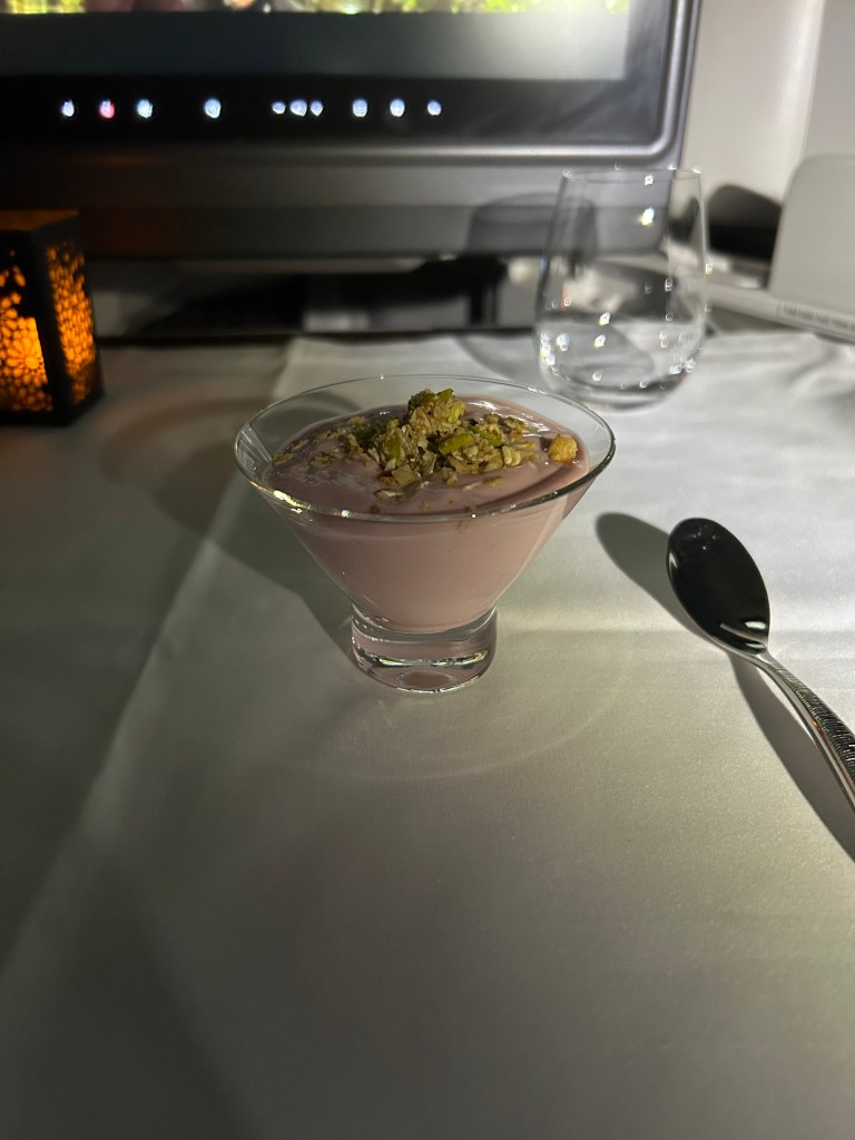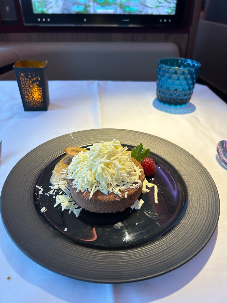 I’d preordered my main meal, which is generally only possible on flights departing Doha although I’ve heard rumours that pre-select dining is available on other routes. The five spice ribs were incredible! Slightly gelatinous and melty but the flavour, with just a touch of heat was swoon worthy. The charred pak choi and mushrooms added a freshness, but the lobster starter was a bit bland. The soya quail egg was good but a tiny morsel and the prawn had the slightest touch of lemongrass but otherwise, it wasn’t a dish to get excited by. Those ribs though – I’d have them again!