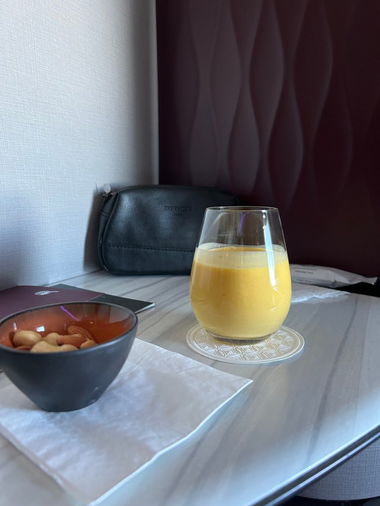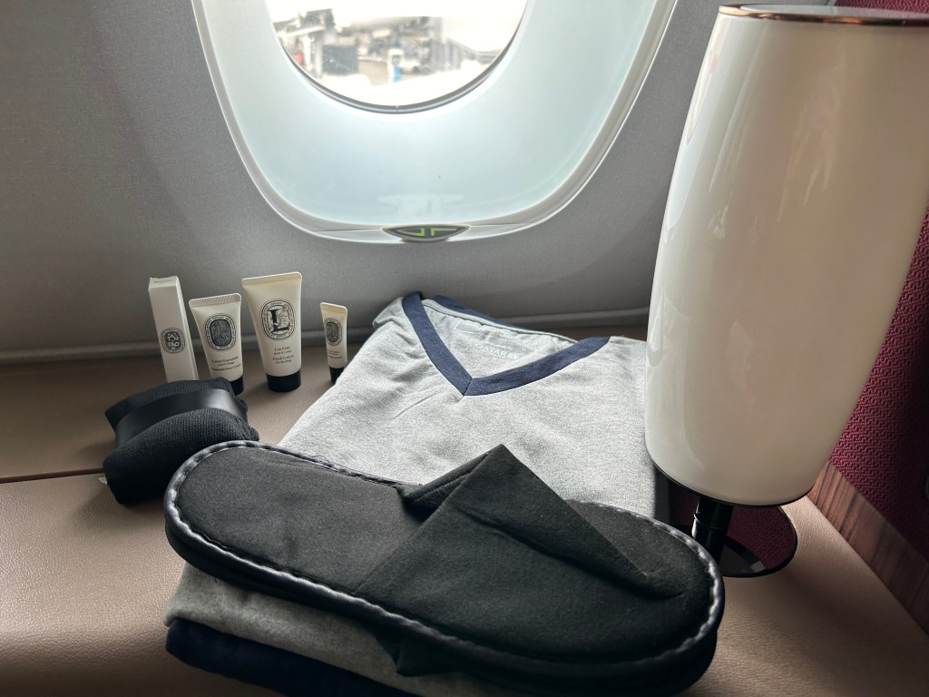 Whilst being served my champagne with a bowl of olives and Parmesan, menus, Diptyque amenity kits and The White Company pyjamas were handed out. The First Class kits were the same as those in Business Class but still excellent quality, and a marked improvement from when I last flew Qatar to Japan, before the pandemic. The pjs included slippers in every set, although the new slippers aren’t as good as the ones we got when we went to Japan. We use the slippers as guest slippers at home or when we go away, but some people sell the pj sets on eBay! Top tip when flying Qatar, because most trips involve 4 flights, there’s a lot of stuff, so bring an extra bag to put it all in! I had a backpack in my backpack so I had somewhere to put the pjs and amenity kits!