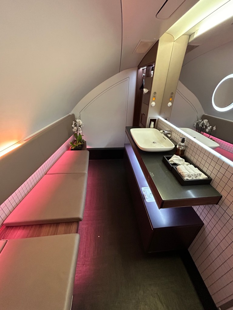 Another spectacular feature of the A380 is the ginormous bathrooms, so there’s plenty of space to change into your pjs. With cushioned seating all along one side, it’s not even obvious which bit is the loo! A full size sink and a draw full of hygiene kits, they’re bigger than some people’s bathrooms at home!