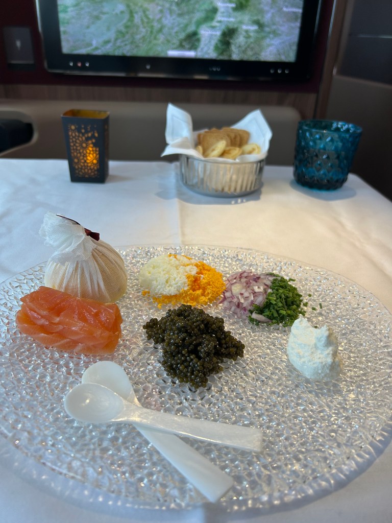One of the differences between First and Business Class is the caviar course in First Class. Honestly?Not sure I get the fuss about caviar. It was alright. The Balik salmon, however, was lovely. 3 thick slices and just a touch of smoke. It went very well with the Bollinger.