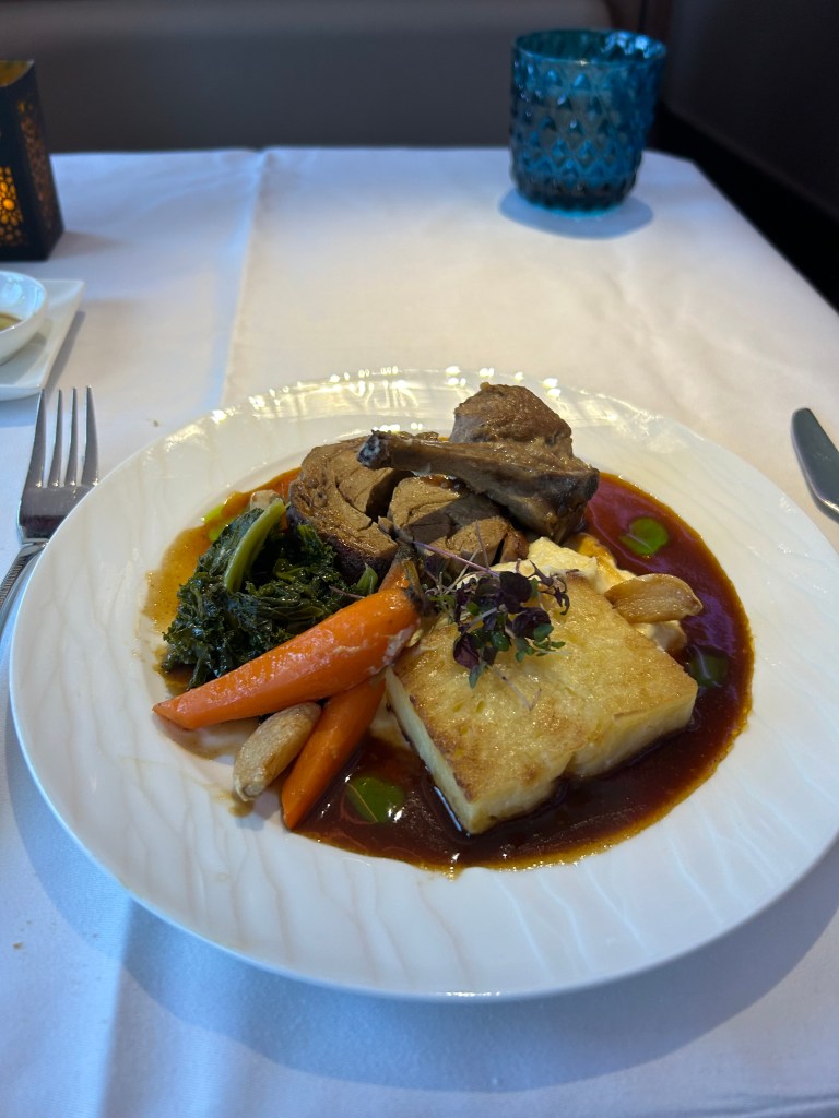The king crab starter was something different to have on a plane and I usually find scallops overrated but this one was meaty and flavourful. The star of the dish was the crab, with hints of sea salt and memories of the seaside. I’d ordered a duo of lamb for my main course and it was so tender, it just fell off the bone. The roasted garlic had a delicious sweetness to it.