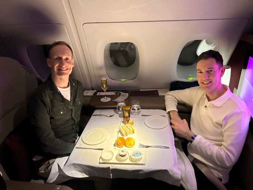 After a few drinks in the bar, we returned to our seats for afternoon tea about an hour and a half before landing. First Class has companion dining so we sat together which was really lovely. Fortunately, we shared the afternoon tea which had a beef, a salmon and a cheese sandwich with a chocolate and apricot Battenberg and profiterole as both of us were still stuffed from lunch. The scones were some of the tastiest we’ve ever had (and we eat a lot of scones!), warm, soft and delicious. We had afternoon tea on the return flight too, which was salmon, curried chicken and cheese sandwiches with a delicious macron, which I said was raspberry, and he said was caramel!