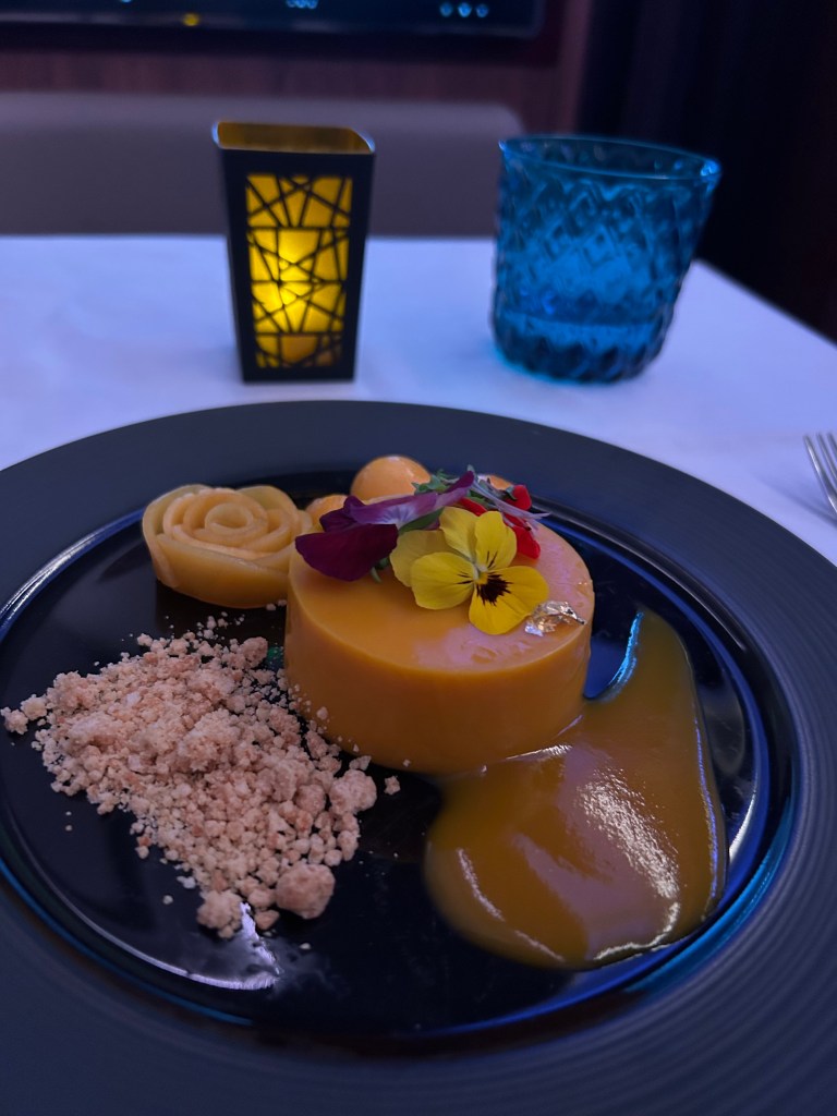 As soon as the dessert was presented, it just looked perfect. The flowers on the top, the flower made from mango, the sparkle of silver. It was exquisite. The flavours…very subtle. The mango comes through and it’s very refreshing and light, which, I’m actually quite glad of, feeling pretty full.