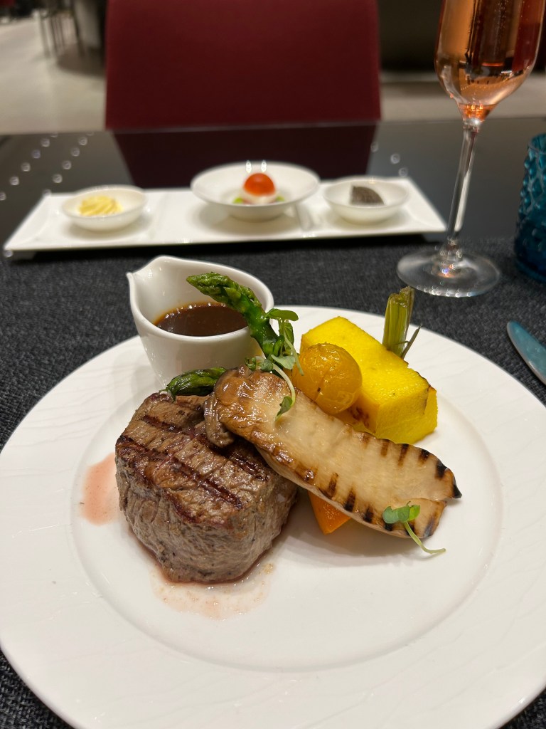 And why doesn’t the catering in the lounge match what’s offered on board? I appreciate that Qatar only offers long haul First Class on limited (albeit usually high value) routes and most of their First Class customers are flying within the Middle East on lower fares, but to offer something worse than a passenger can get in Business Class in the air just feels odd. The champagne really is standard stuff that retails at about £35 a bottle. After drinking about 8 glasses of Bolly on the plane, you could really tell! Having said that, the wagyu steak was perfectly cooked, the rare side of medium rare. It was soft and tasty with the hint of chargrill. It was a decent steak.