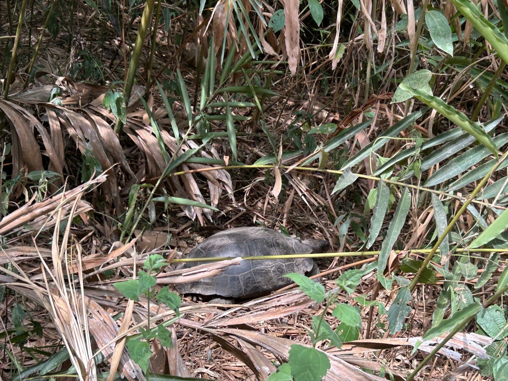 It’s barely a road, just a dirt track up the side of the mountain. It doesn’t have the sheer drops that some mountain roads have but it is bumpy as hell! And I mean bumpy! It takes a good hour to get to the top, and because the road is so narrow, there’s set times for going up and set times for going down. A few days before, Mong had spotted an old tortoise along the road and we managed to find him again, just munching on some grass!