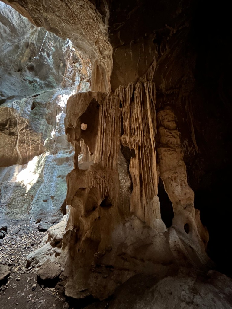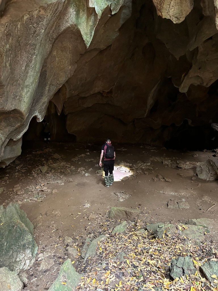 There’s 2 campsites on the park, and a cafe which sells some basic camping equipment. The meals are simple, absolutely delicious and cheap – a curry and rice dish around 60baht (£1.30). Bottles of pop, like sprite or coke, 25baht (55p). After the excitement of the elephant, we stopped for lunch and then trekked through the jungle some more. Mong took us on a death defying climb in to a cave to see if we could spot some snakes, but we only found bats – vampire bats!