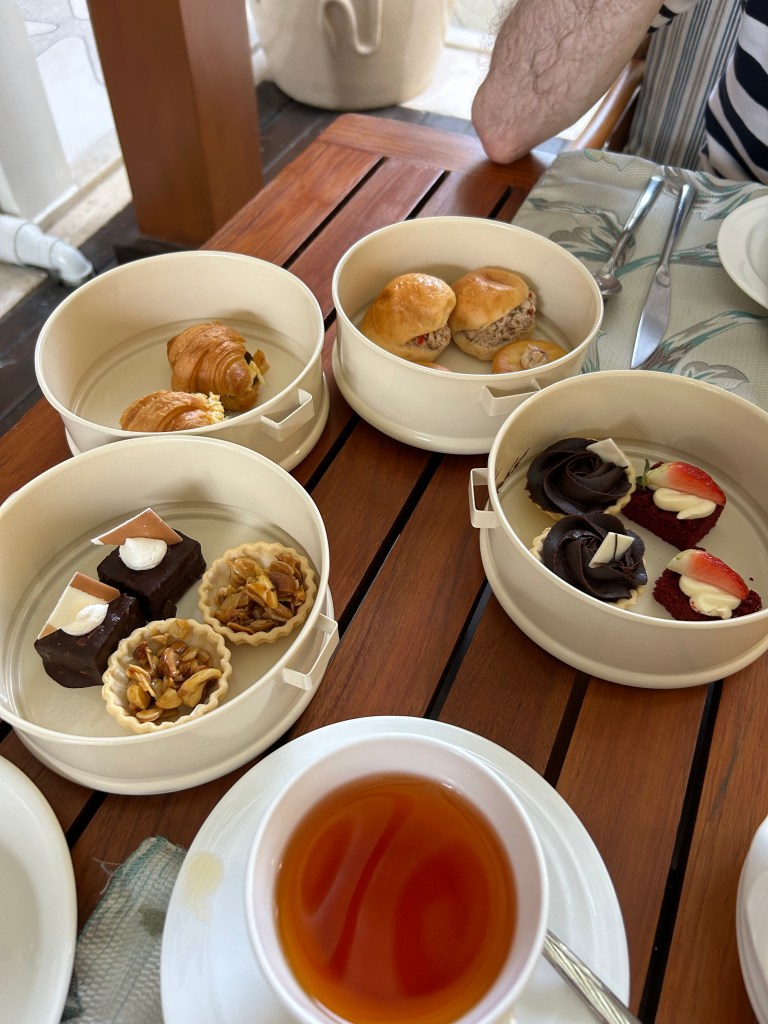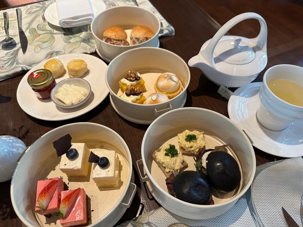 We didn’t have afternoon tea every day, but for our second round, we enjoyed tuna sandwich, egg mayo croissant and salmon mouse cracker. The sweets were peanut brittle, red velvet cake, lemon scones, chocolate mousse cake and a brownie. The brownie was the best! And, of course, the vanilla tea!