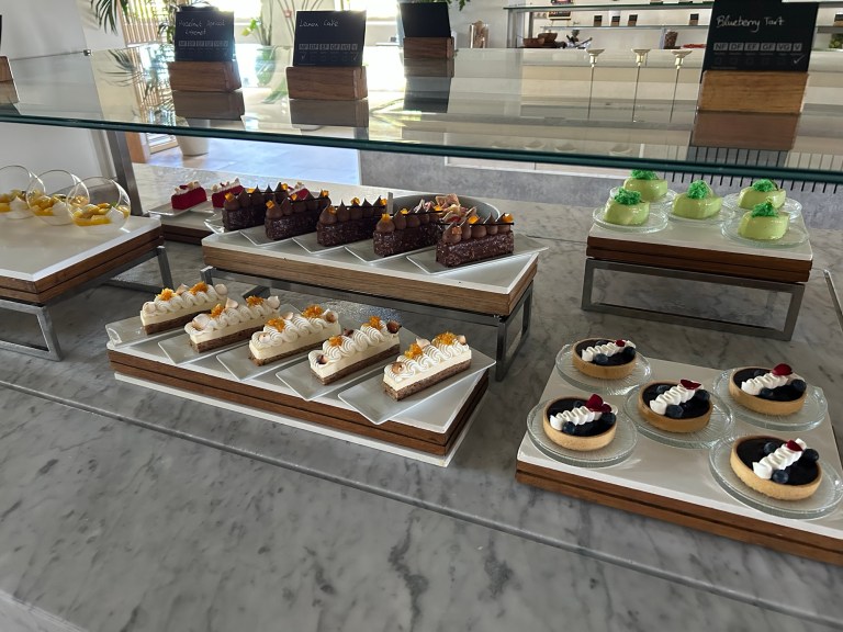 Check-in completed, we headed to Ouzo for lunch. The other half had pork gyros which was massive and came with a pile of fries whereas my vegan moussaka was probably a bit on the small side and could have benefited from an accompanying dish. The salad starters were both excellent, as were the pistachio parfait and orange pie (although if you’ve had the phenomenal orange cake at Ouzo at Oceania, it’s not as good as that!).