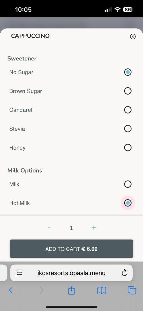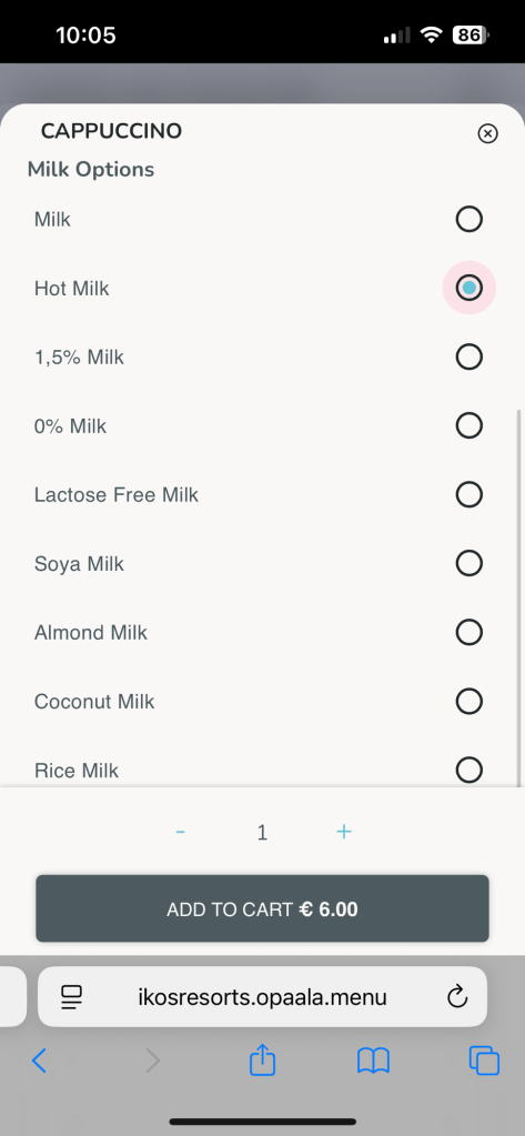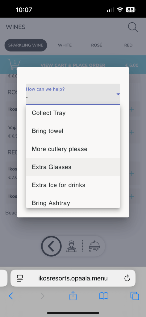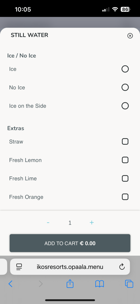 Whilst we didn’t have much pool time owing to the weather, I did get to play around with the new QR code ordering service when sitting by the adults only spa pool one morning. I loved the customisable options and the ability to add notes. I know there’s been some controversy at other resorts with a function for tipping on these QR codes, but that wasn’t available at Ikos Andalusia. The service was nonetheless slick, with my first order taking about 15 minutes to arrive and second round coming in about 4 minutes. Staff were still coming around to ask for orders, so if you don’t have your phone, or don’t want to use the QR code, you won’t notice any difference. You can even order random stuff, like extra towels, fresh glasses or cutlery!